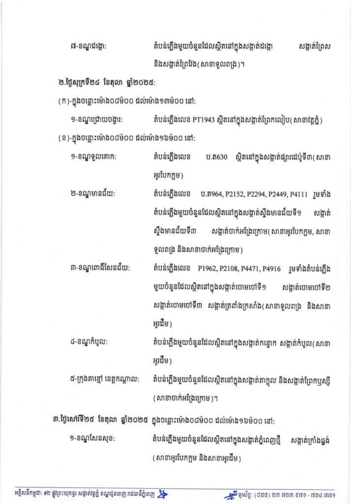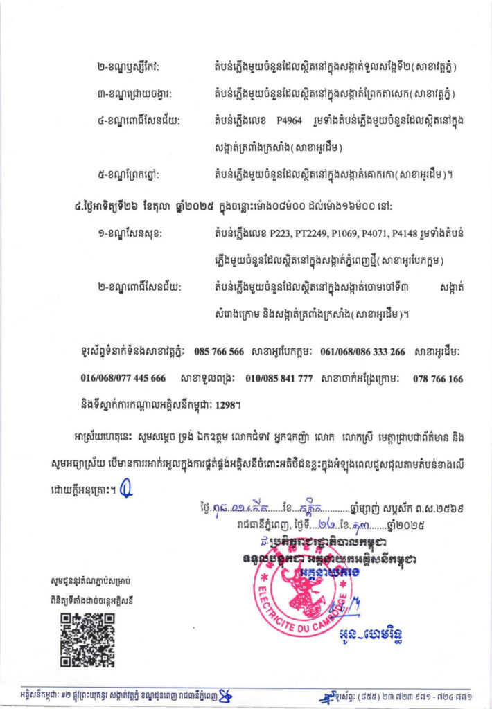 EDC ជូនដំណឹង ពីការរអាក់រអួលចរន្ត តាមតំបន់សង្កាត់ ខណ្ឌ មួយចំនួនចាប់ពីថ្ងៃនេះ ដល់ថ្ងៃទី២៦ ខែតុលា ឆ្នាំ ២០២៥ ដើម្បីរុះរើគន្លងខ្សែបណ្តាញ ផ្លាស់ប្តូរ តម្លើង បរិក្ខារ ងាយស្រួលដល់ការដ្ឋានពង្រីកផ្លូវ