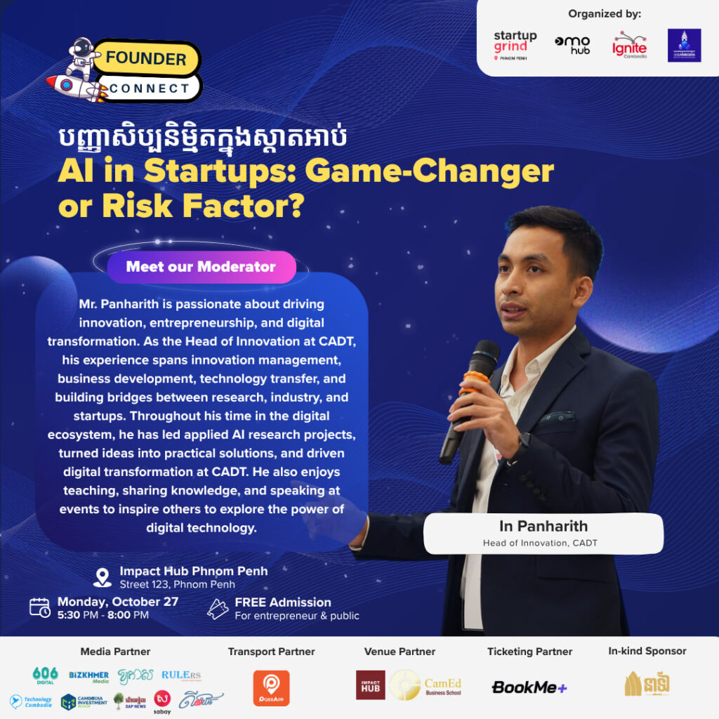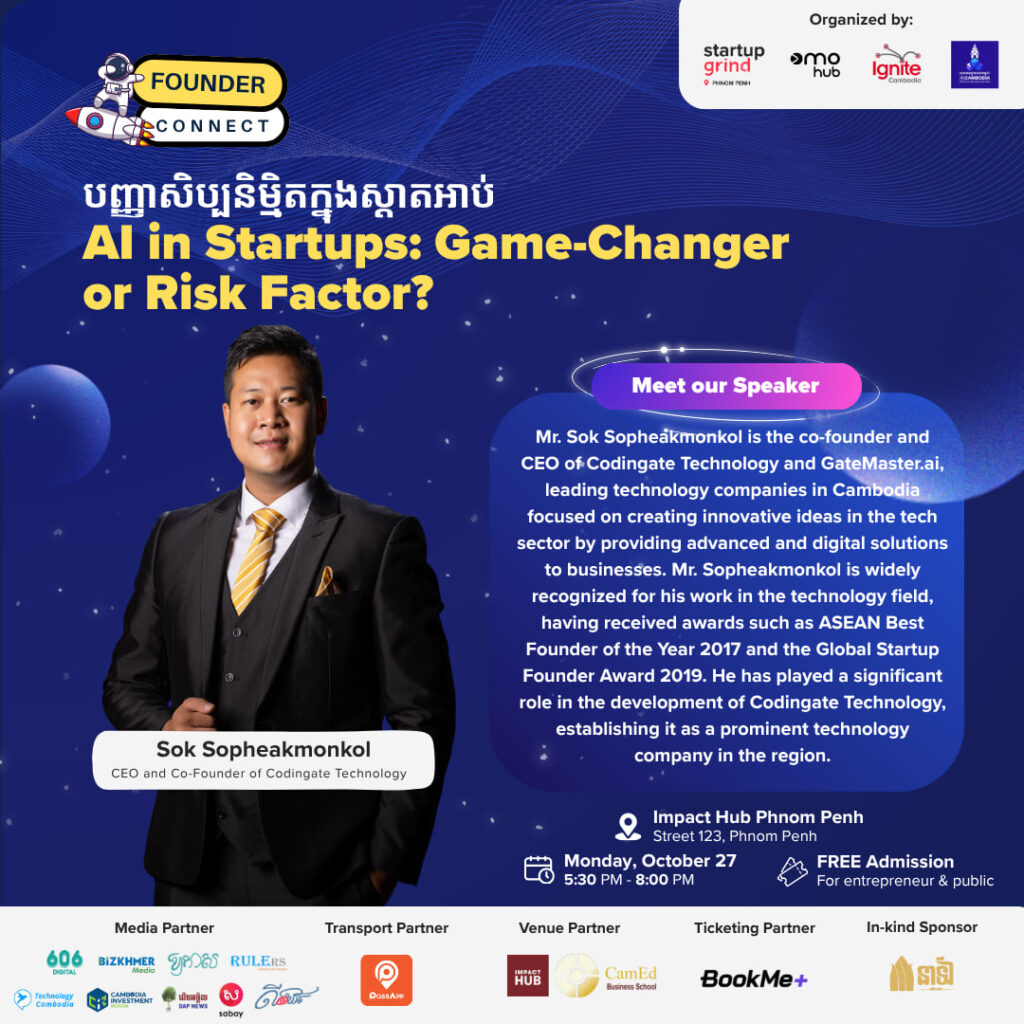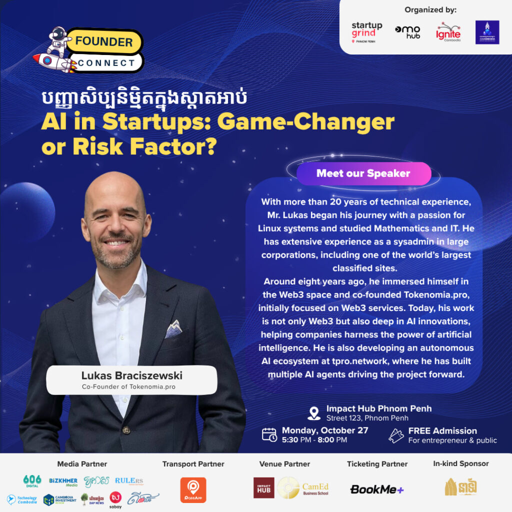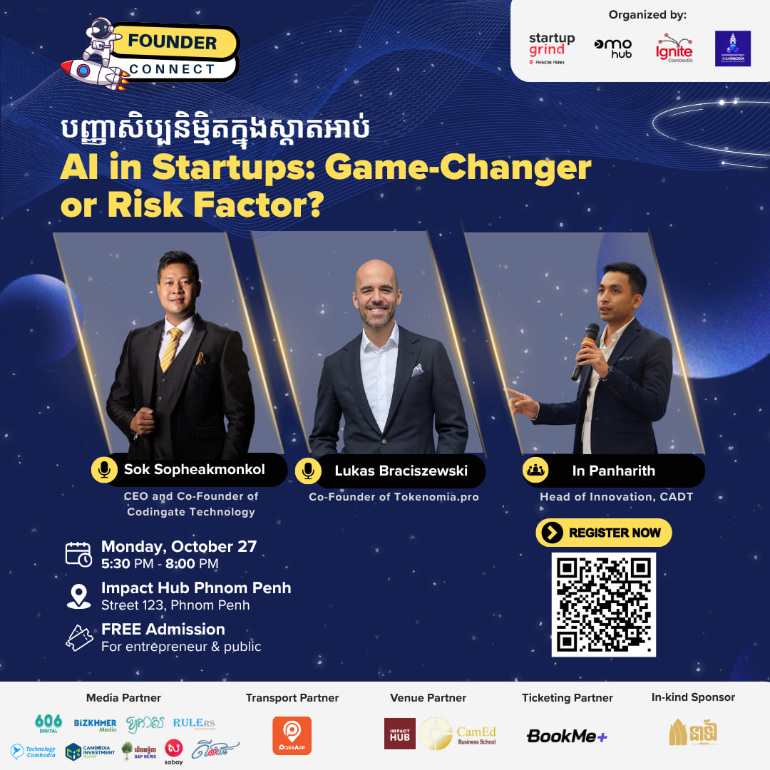 ភ្នំពេញ ៖ Startup Grind Cambodia មានសេចក្តីសោមនស្សរីករាយ ក្នុងការរៀបចំកម្មវិធី Founder Connect នាពេលខាងមុខនេះក្រោមប្រធានបទ “AI in Startups: Game-Changer or Risk Factor?” ដែលនឹងប្រព្រឹត្តទៅនៅថ្ងៃច័ន្ទ ទី 27 ខែតុលា ឆ្នាំ 2025 ពីម៉ោង 5:30 PM ដល់ 8:00 PM នៅ Impact Hub Phnom Penh។