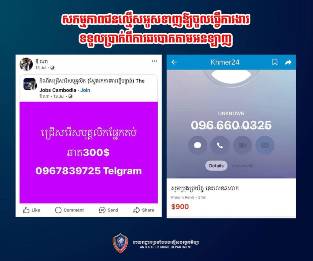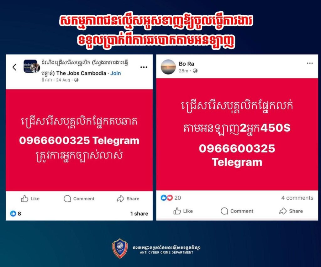 ក្នុងនោះដែលគណនីហ្វេសប៊ុក របស់ជនអនាមិកនៅតែបន្ដបង្ហោះផ្សព្វផ្សាយទិញ-លក់ទូរស័ព្ទ និងស្វែងរកអ្នកចូលរួមធ្វើសកម្មភាពទទួលប្រាក់ និងតបឆាត តាមរយៈលេខទូរស័ព្ទ ០៩៦ ៦៦០ ០៣២៥, ០៩៦ ៧៨៣ ៩៧២៥ និងបានឱ្យQR Codeរបស់គណនីធនាគារផ្សេងៗ តាមបណ្ដាញសង្គមនានា ក្នុងគោលបំណងជ្រើរើសបុគ្គលិក សម្រាប់ការងារ។