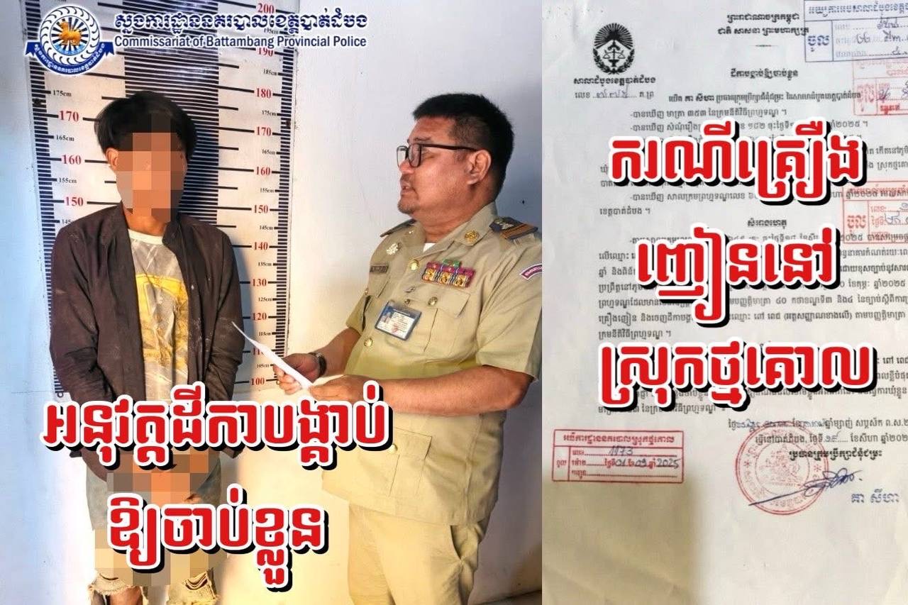 បាត់ដំបង៖ នៅថ្ងៃទី២៣ ខែតុលាឆ្នាំ ២០២៥នេះសមត្ថកិច្ចនគរបាលស្រុកថ្មគោលបញ្ជូនពិរុទ្ធជនម្នាក់ ក្នុងករណីគ្រឿងញៀនមកផែនជំនាញដេីម្បីអនុវត្តតាមនីតិវិធី បន្ទាប់ពីបានច-ាប់ខ្លួនកាលពីថ្ងៃទី ២២ ខែ តុលា ឆ្នាំ២០២៥ វេលាម៉ោង ០៨និង ៣០ នាទីនៅចំណុចក្រុមទី២៥ ភូមិ បឹង ព្រីង ឃុំ បឹងព្រីង ស្រុក ថ្មគោល ខេត្តបាត់ដំបង។