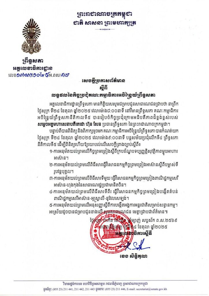 ព័ត៌មានជាតិ លទ្ធផលកិច្ចប្រជុំ គណៈកម្មាធិការអចិន្រ្តៃយ៍ព្រឹទ្ធសភា នីតិកាលទី៥ នៅព្រឹកនេះ By KD102 Posted on October 24, 2025 Related Items:សម្តេចតេជោ Recommended for you សម្តេចតេជោ ហ៊ុន សែន អញ្ជើញដឹកនាំកិច្ចប្រជុំគណៈកម្មាធិការអចិន្ត្រៃយ៍ព្រឹទ្ធសភា នីតិកាលទី៥ ដើម្បីពិនិត្យសម្រេចលើរបៀបវារៈចំនួន៧ លោក ហ៊ុន ម៉ានី៖ ជនជាតិថៃមួយចំនួនធ្វើទង្វើអសីលធម៌លើ សម្ដេចតេជោ ហ៊ុន សែន មិនស័ក្តិសមជាប្រជាជនស៊ីវិល័យ សម្តេចតេជោ៖ រាជរដ្ឋាភិបាល នឹងបង្កើនថវិកាពី ៤ពាន់ទៅ៨ពាន់លានរៀល សម្រាប់អតីតយុទ្ធជន និងនិវត្តជន