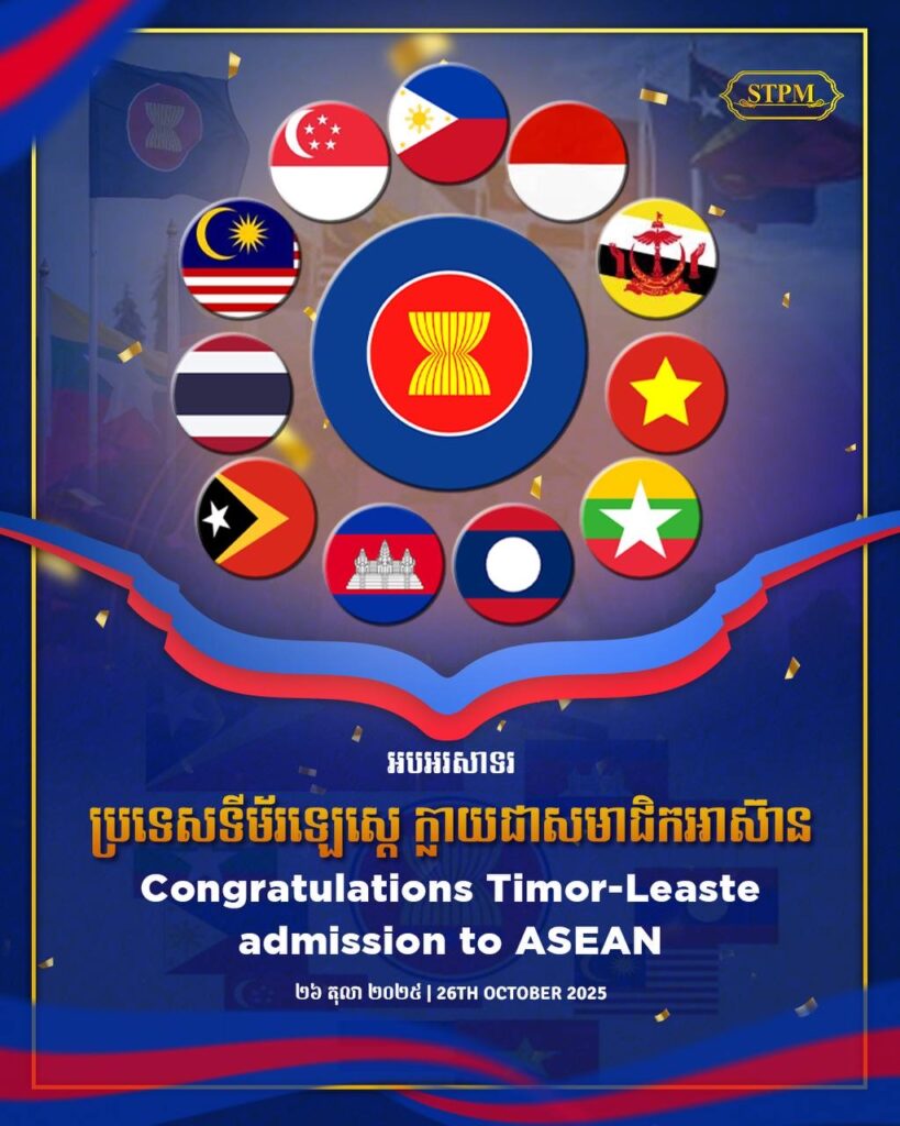 ភ្នំពេញ ៖ សម្តេចមហាបវរធិបតី ហ៊ុន ម៉ាណែត នាយករដ្ឋមន្ត្រីនៃកម្ពុជា នៅថ្ងៃទី២៦ ខែតុលា ឆ្នាំ២០២៦នេះ បានបង្ហោះសារអបអរសាទរ សាធារណរដ្ឋប្រជាធិបតេយ្យទីម័រឡេស្តេ ក្លាយជាសមាជិក ពេញសិទ្ធិ នៃសមាគមប្រជាជាតិអាស៊ីអាគ្នេយ៍ (អាស៊ាន) ក្នុងឱកាសកិច្ចប្រជុំកំពូលអាស៊ានលើកទី៤៧ នៅទីក្រុងគូឡាឡាំពួរ ប្រទេសម៉ាឡេស៊ី។