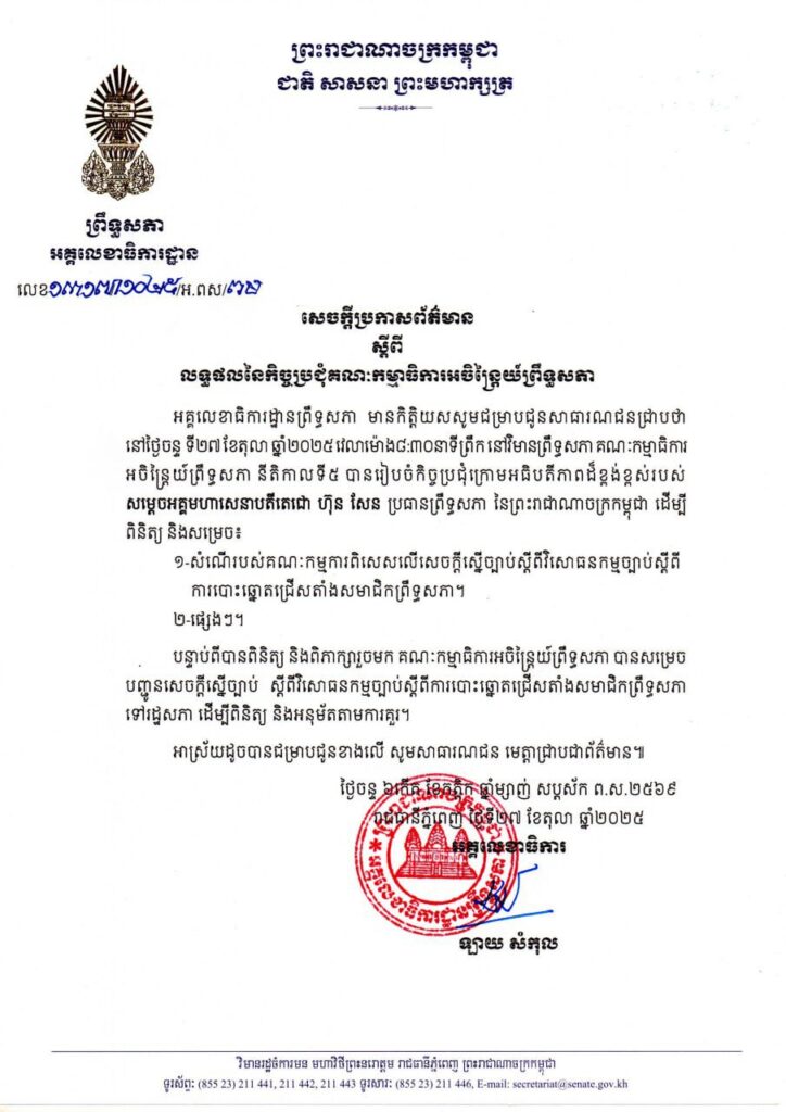 ព័ត៌មានជាតិ គណៈកម្មាធិការ អចិន្រ្តៃយ៍ព្រឹទ្ធសភា បញ្ជូនសេចក្តីស្នើច្បាប់ វិសោធនកម្មច្បាប់បោះឆ្នោត ជ្រើសតាំង សមាជិកព្រឹទ្ធសភា ទៅរដ្ឋសភា By PH104 Posted on October 27, 2025 Related Items: