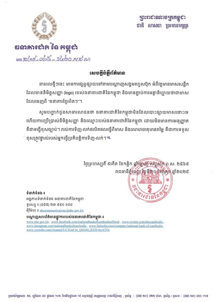 ភ្នំពេញ ៖ ធនាគារជាតិនៃកម្ពុជា មិនដែលបោះផ្សាយមាសនោះទេ ហើយការប្រើប្រាស់និមិត្តសញ្ញា និងឈ្មោះរបស់ធនាគារជាតិនៃកម្ពុជា ដោយមិនមានការអនុញ្ញាត នៅលើក្រដាសមាស គឺជាទង្វើខុសច្បាប់ ។