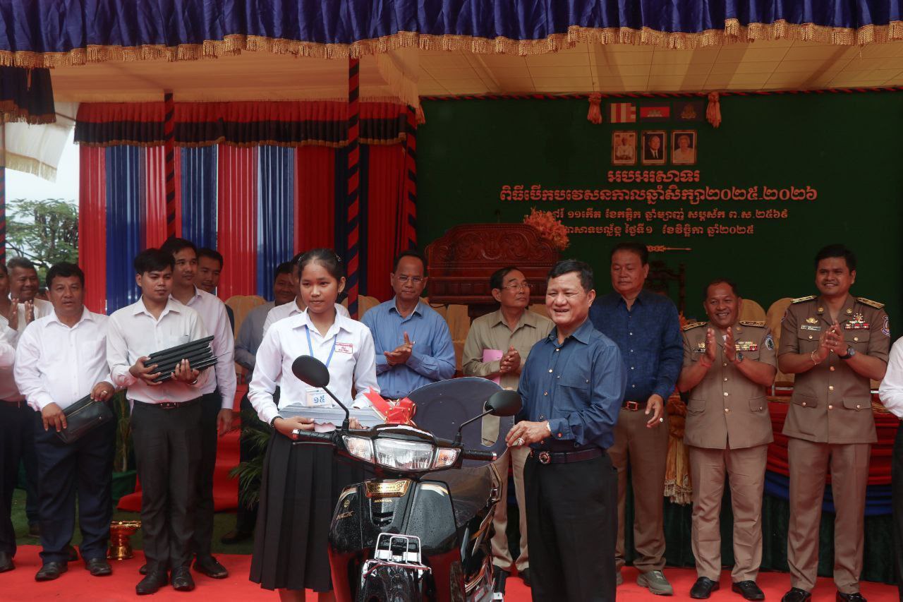 សូមបញ្ជាក់ថា លោកអ្នកឧកញ៉ា ទ្រី ភាព បានប្រគល់អំណោយដ៏ថ្លៃថ្លារបស់សម្ដេចតេជោ និងសម្ដេចកិត្តិព្រឹទ្ធបណ្ឌិត ដល់សិស្សជ័យលាភីប្រឡងជាប់សញ្ញាបត្រមធ្យមសិក្សាទុតិយភូមិនិទ្ទេសA ទទួលបានម៉ូតូហុងដាឌ្រីមឆ្នាំ២០២៦ ១គ្រឿង ថវិកា៤០០.០០០រៀល, សិស្សជ័យលាភីនិទ្ទេសBចំនួន៨នាក់ ក្នុងម្នាក់ទទួលបានកុំព្រូទ័រ១គ្រឿង និងថវិកា៤០០.០០០រៀល។ ថវិកា កុំព្យូទ័រ និងម៉ាស៊ីនព្រីន ឧបត្ថម្ភដល់រដ្ឋបាលស្រុក អធិការដ្ឋាននគរបាលស្រុក ប៉ុស្តិ៍នគរបាលស្រុក និងឃុំទាំង៧ ការិយាល័យអប់រំស្រុក វិទ្យាល័យប្រាសាទបល្ល័ង្ក ប្រជាការពារ កងរាជអាវុធហត្ថ យោធាសឹករងស្រុក លោកគ្រូអ្នកគ្រូចូលនិវត្តន៍ លោកគ្រូអ្នកគ្រូ ក្នុង១នាក់ទទួលបានថវិកា ៥០.០០០រៀល និងសិស្សានុសិស្ស១.០១០នាក់ ក្នុងម្នាក់ទទួលបានសៀវភៅ៥ក្បាល ប៊ិច៥ដើម និងថវិកា ១០.០០០រៀល។ ចំណាយក្នុងកម្មវិធីសរុបជាទឹកប្រាក់ប្រមាណ ២៣០.០០០.០០០រៀល៕