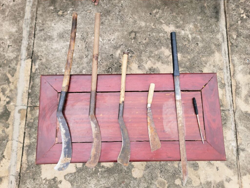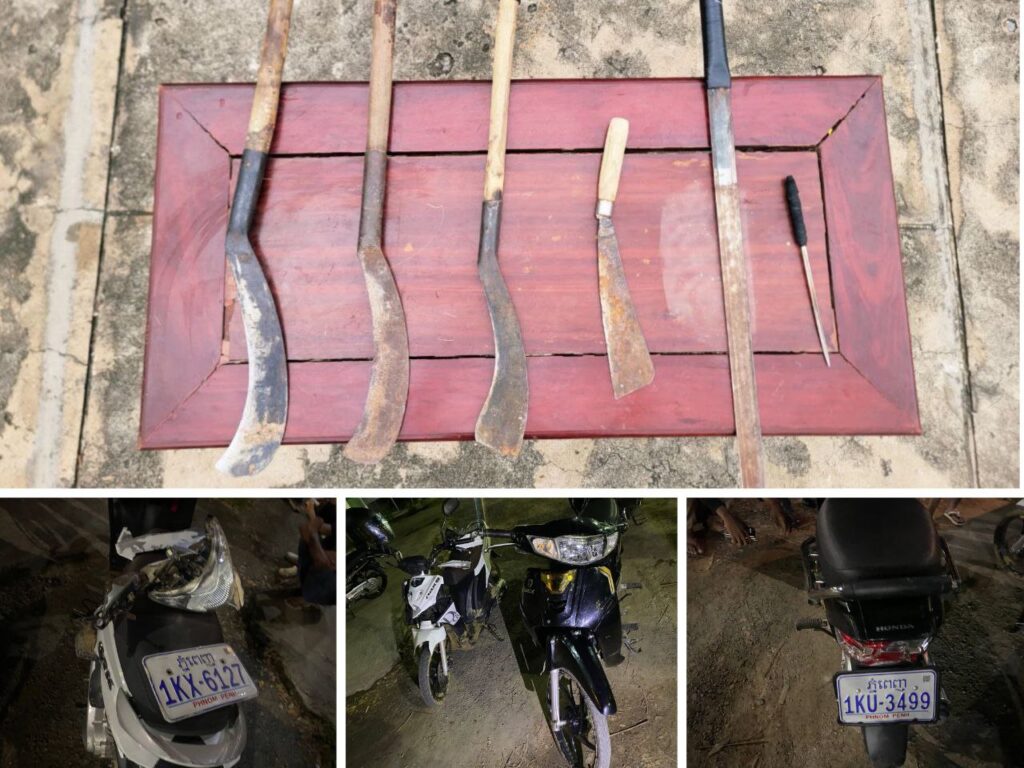 ចាប់យកវត្ថុតាងរួមមាន:កាំបិតផ្កាក់ចំនួន០៤ដេីម,ដាវចំនួន០១ដេីម និងដែកឆាបចុងស្រួចចំនួន០១ដេីមថែមទៀតផង។