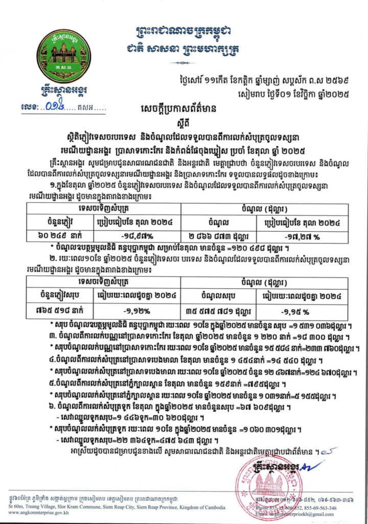 យោងតាមសេចក្តីប្រកាសព័ត៌មាន របស់គ្រឹះស្ថានអង្គរ នាពេលថ្មីៗនេះ បានឲ្យដឹងថា «ពីខែមករា ដល់ខែតុលា ឆ្នាំ២០២៥ ចំនួនភ្ញៀវទេសចរបរទេស បានចូលទស្សនារមណីយដ្ឋានអង្គរ មានចំនួន ៧៦៥ ៥១៨ ថយចុះ១.១២% ដោយផ្តល់ចំណូលបាន ៣៥ ៥៧៥ ៧៨១ដុល្លារ ថយចុះ ១.១៥% បើធៀបនឹងរយៈពេលដូចគ្នាកាលពីឆ្នាំមុន»៕