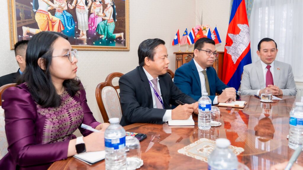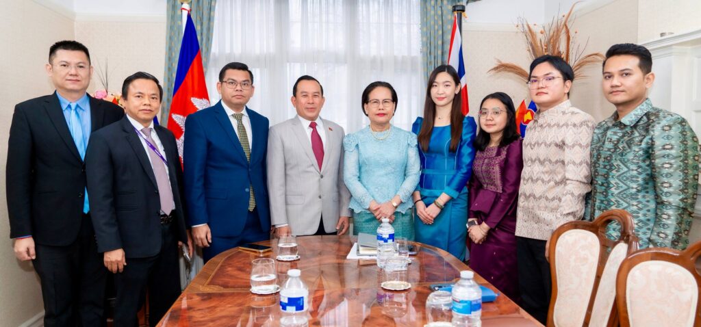 នាឱកាសដឹកនាំគណៈប្រតិភូក្រសួងទេសចរណ៍ និងក្រុមប្រឹក្សាភិបាលសិក្សាទីផ្សារ និងផ្សព្វផ្សាយទេសចរណ៍កម្ពុជា (CTB) ចូលរួមពិព័រណ៍ទេសចរណ៍ពិភពលោក (World Travel Market) កាលពីថ្ងៃទី៧ ខែវិច្ឆិកា ឆ្នាំ២០២៥ នៅទីក្រុងឡុងដ៏ ចក្រភពអង់គ្លេស លោក ហួត ហាក់ រដ្ឋមន្ត្រីក្រសួងទេសចរណ៍ បានអញ្ជើញជួបសំណេះសំណាល សាកសួរសុខទុក្ខ និងពិភាក្សាការងារជាមួយលោកស្រី ទួត បញ្ញា ឯកអគ្គរាជទូតវិសាមញ្ញ និងពេញសមត្ថភាព​ របស់ព្រះរាជាណាចក្រកម្ពុជា ប្រចាំចក្រភពអង់គ្លេស ព្រមទាំងសហការី នៅស្ថានឯកអគ្គរាជទូតកម្ពុជា នៅទីក្រុងឡុងដ៏ ចក្រភពអង់គ្លេស។