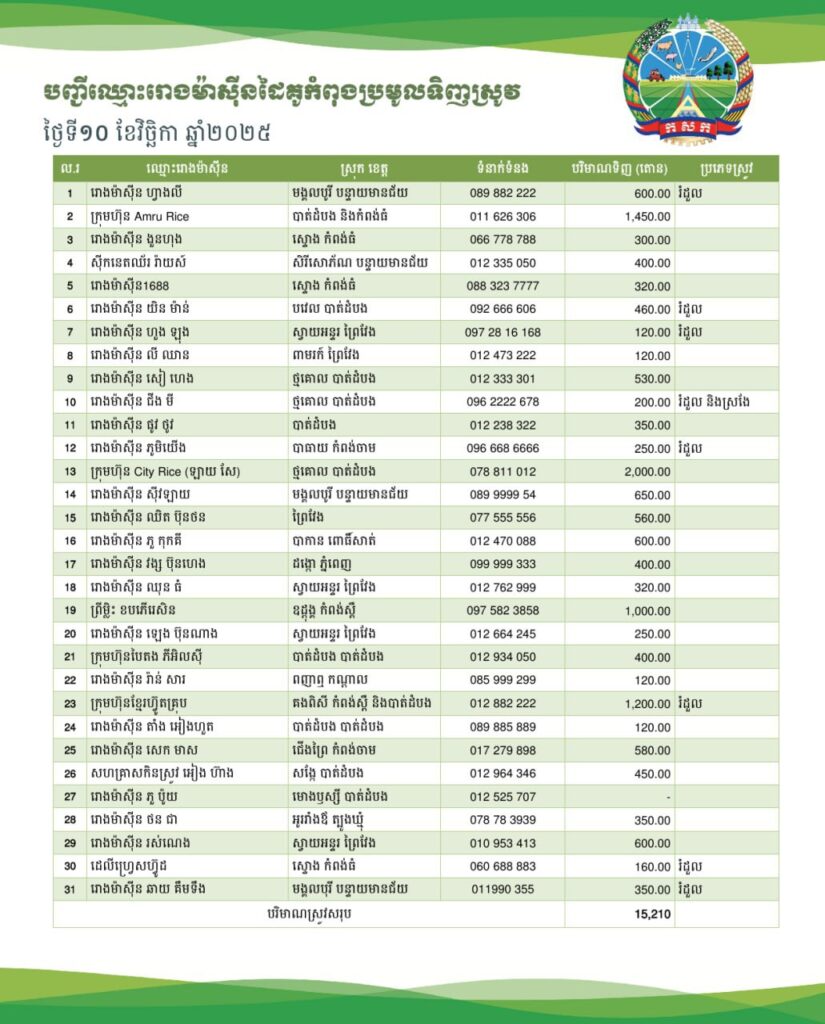 ភ្នំពេញ ៖ ក្រសួងកសិកម្ម រុក្ខាប្រមាញ់ និងនេសាទ នៅថ្ងៃទី១០ ខែវិច្ឆិកា ឆ្នាំ២០២៥បានបង្ហាញពីរោងម៉ាស៊ីនកិនស្រូវ ជាដៃគូរបស់ក្រសួងកសិកម្ម រុក្ខាប្រមាញ់ និងនេសាទ បន្តប្រមូលទិញស្រូវជាង ១៥០០០ តោន ពីប្រជាកសិករទូទាំងប្រទេស ។