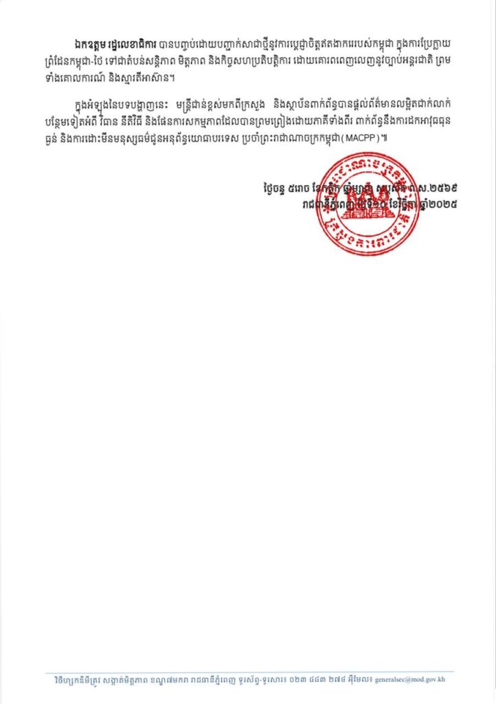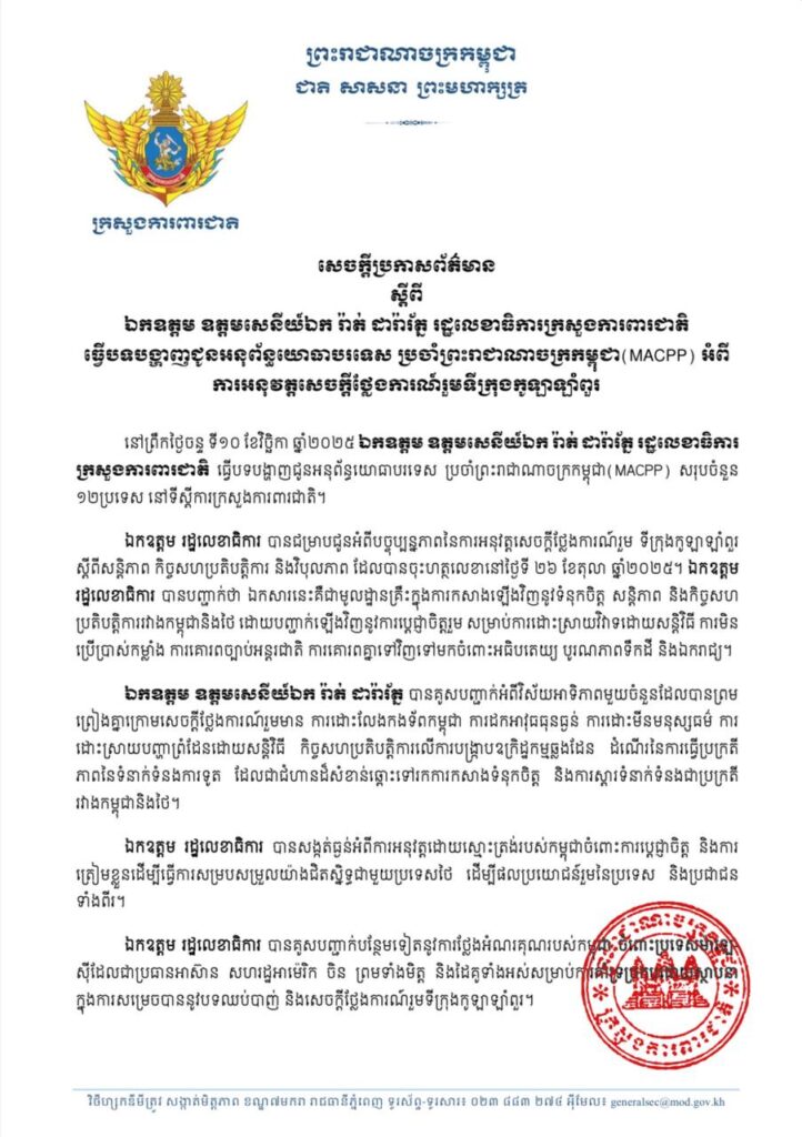 អ្នកនាំពាក្យការពារជាតិ បង្ហាញលទ្ធផល នៃការធ្វើបទបង្ហាញ ពីកិច្ចព្រមព្រៀង សន្តិភាពកម្ពុជា-ថៃ ទៅអនុព័ន្ធយោធាបរទេស