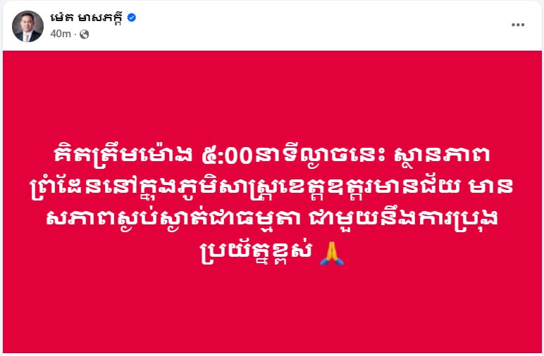 នេះបើតាមសារសំណេរ លើបណ្ដាញសង្គមហ្វេសប៊ុករបស់ លោក ម៉េត មាសភក្ដី អភិបាលរងខេត្តឧត្តរមានជ័យ នាល្ងាចថ្ងៃទី១២ ខែតុលា ឆ្នាំ២០២៥។