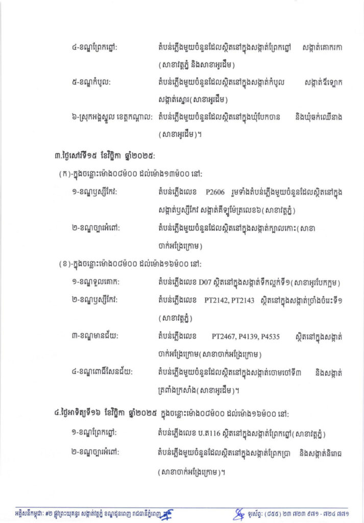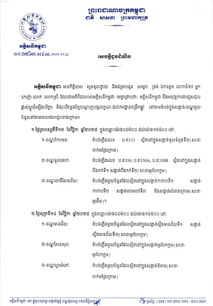 EDC ជូនដំណឹងពីការរអាក់រអួលចរន្ត តាមតំបន់សង្កាត់ ខណ្ឌ មួយចំនួនចាប់ពីថ្ងៃនេះ ដល់ថ្ងៃទី១៦ ខែវិច្ឆិកា ឆ្នាំ២០២៥ ដើម្បីរុះរើគន្លងខ្សែបណ្តាញ ផ្លាស់ប្តូរ តម្លើង បរិក្ខារ ងាយស្រួលដល់ការដ្ឋានពង្រីកផ្លូវ