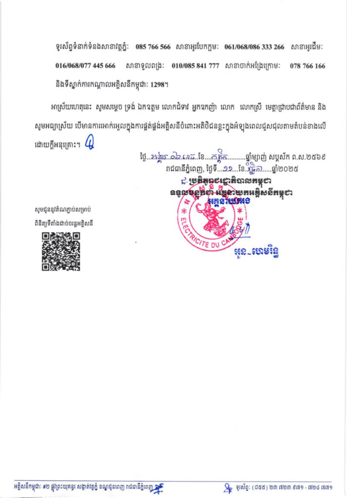 សូមអានសេចក្តីជូនដំណឹង របស់អគ្គិសនីកម្ពុជា ដូចខាងក្រោម ៖