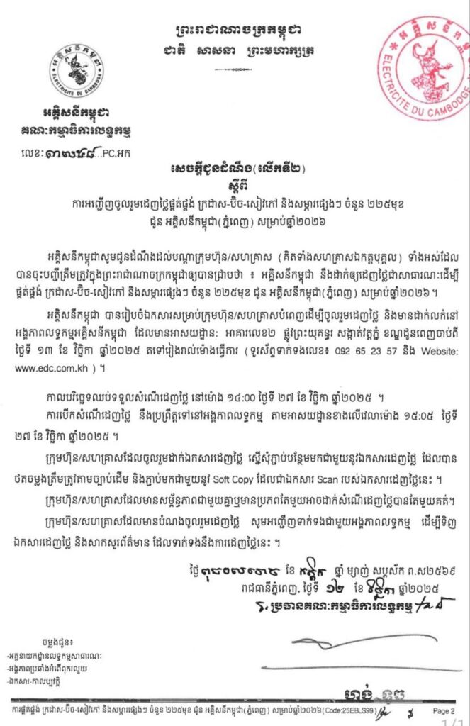 ភ្នំពេញ ៖ អគ្គិសនីកម្ពុជា សូមជូនដំណឹងដល់បណ្តា ក្រុមហ៊ុន/សហគ្រាស (គិតទាំងសហគ្រាសឯកត្តបុគ្គល) ទាំងអស់ដែល បានចុះបញ្ជីត្រឹមត្រូវ ក្នុងព្រះរាជាណាចក្រកម្ពុជាឲ្យបានជ្រាបថា ៖ អគ្គិសនីកម្ពុជា នឹងដាក់ឲ្យដេញថ្លៃ ជាសាធារណៈដើម្បី ផ្គត់ផ្គង់ ក្រដាស-ប៊ិច-សៀវភៅ និងសម្ភារផ្សេងៗ ចំនួន ២២៥មុខ ជូន អគ្គិសនីកម្ពុជា(ភ្នំពេញ) សម្រាប់ឆ្នាំ២០២៦។