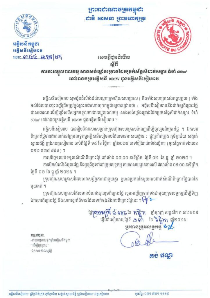 អគ្គិសនីសៀមរាប បានរៀបចំឯកសារសម្រាប់ក្រុមហ៊ុន /សហគ្រាសបំពេញដើម្បីចូលរួមពិគ្រោះថ្លៃ ។ ឯកសារ ពិគ្រោះថ្លៃមានដាក់លក់នៅក្រុមលទ្ធកម្មអគ្គិសនីសៀមរាប ដែលមានអាសយដ្ឋាន: ផ្លូវក្រវ៉ាត់ក្រុង ភូមិភ្ញាជ័យ សង្កាត់ ស្វាយដង្គំ ក្រុង/ខេត្តសៀមរាប ចាប់ពីថ្ងៃទី ១៤ ខែ វិច្ឆិកា ឆ្នាំ២០២៥ តទៅរៀងរាល់ម៉ោងធ្វើការ (ទូរស័ព្ទទាក់ទងលេខ ០១២ ៨៣៥ ៩៩៤) ។