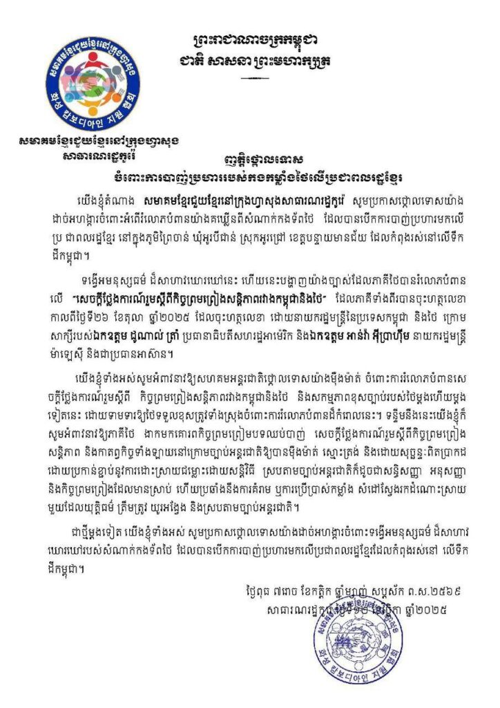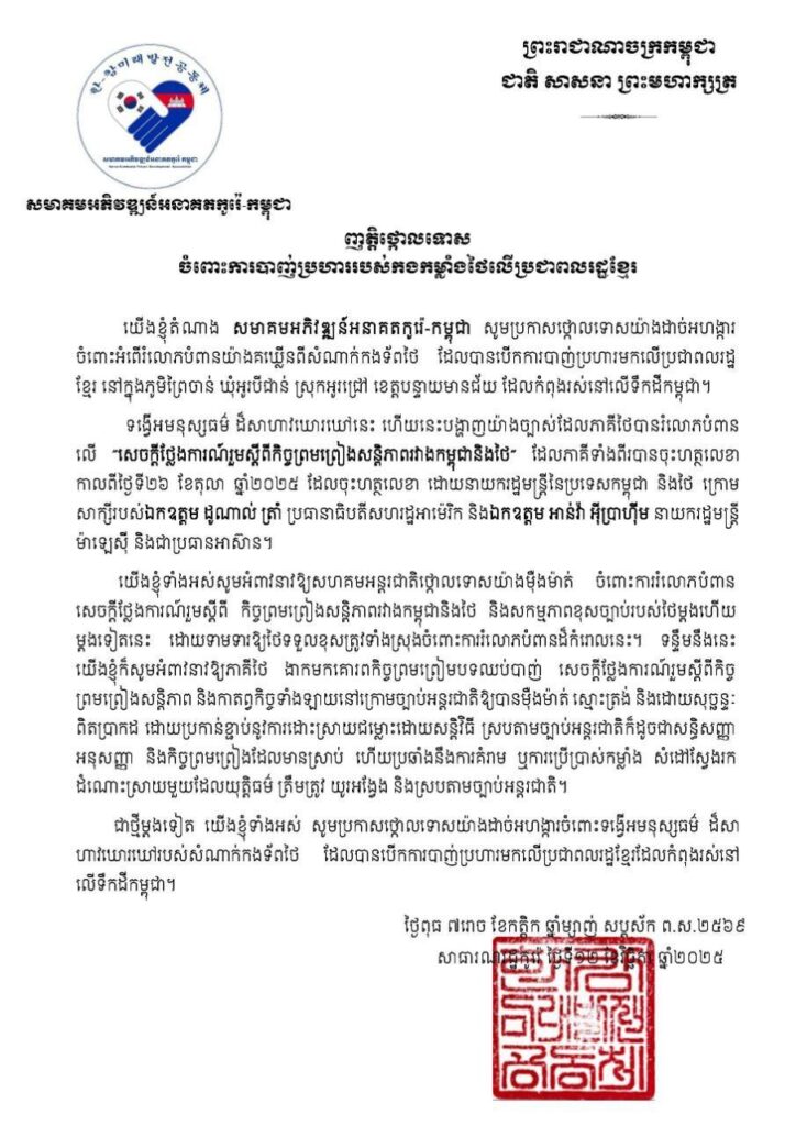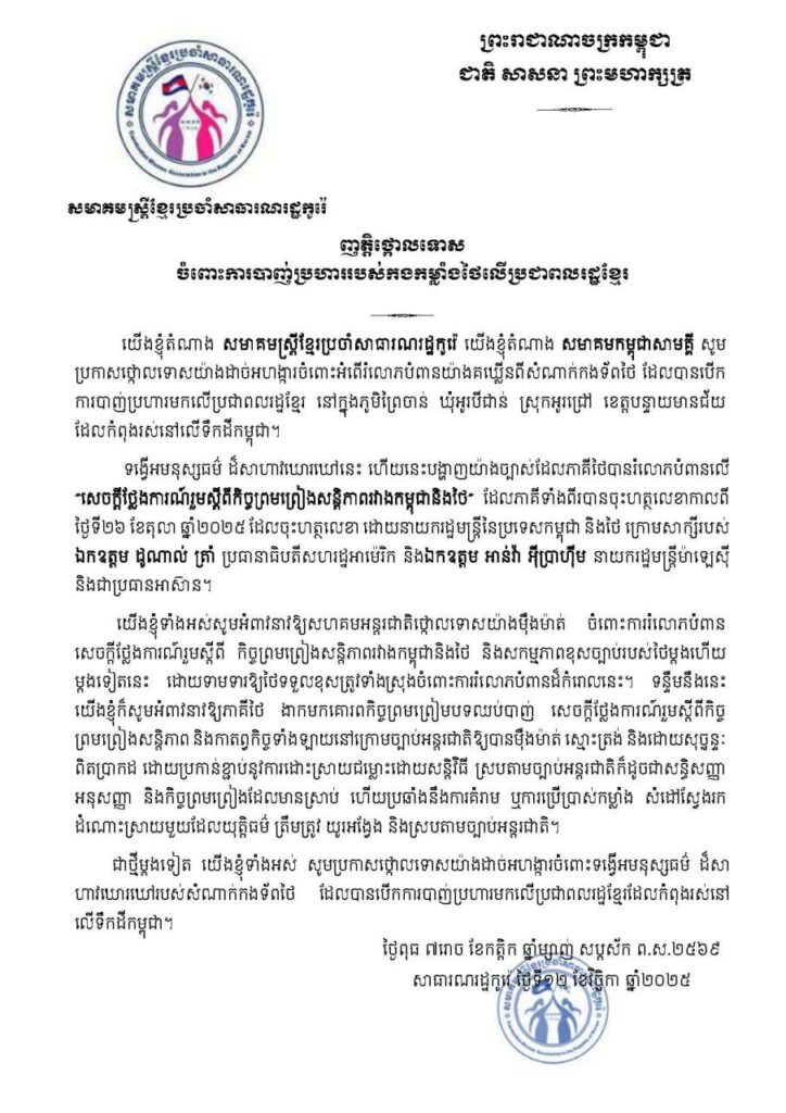 ភ្នំពេញ៖ សមាគមខ្មែរចំនួន៦ ដែលមានមូលដ្ឋាន នៅប្រទេសកូរ៉េខាងត្បូង នៅថ្ងៃទី១៣ ខែវិច្ឆិកា ឆ្នាំ ២០២៥នេះ បានចេញញត្តិដាច់ដោយឡែកពីគ្នា ដោយថ្កោលទោសយ៉ាង ដាច់អហង្ការ ចំពោះអំពើរំលោភបំពានយ៉ាង គឃ្លើនពីសំណាក់កងទ័ពថៃ ដែលបានបើកការបាញ់ប្រហារ មកលើប្រជាពលរដ្ឋខ្មែរ នៅភូមិព្រៃចាន់ ឃុំអូរបីជាន់ ស្រុកអូរជ្រៅ ខេត្តបន្ទាយមានជ័យ ដែលកំពុងរស់នៅលើទឹកដីកម្ពុជា។