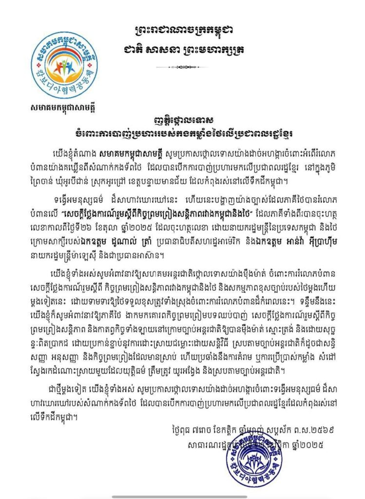 ក្នុងញត្តិថ្កោលទោស សមាគមទាំង៦ បានលើកឡើងពីទង្វើអមនុស្សធម៌ ដ៏សាហាវឃោរឃៅរបស់ថៃ ដែលបង្ហាញយ៉ាង ច្បាស់ថា ភាគីថៃ បានរំលោភបំពានលើ សេចក្តីថ្លែងការណ៍រួមស្តីពីកិច្ចព្រមព្រៀង សន្តិភាពរវាងកម្ពុជានិងថៃ ដែលភាគីទាំងពីរបានចុះហត្ថលេខាកាលពីថ្ងៃទី២៦ ខែតុលា ឆ្នាំ២០២៥ ដោយនាយករដ្ឋមន្ត្រីនៃប្រទេសទាំងពីរដែលមាន ឯកឧត្តម ដូណាល់ ត្រាំ ប្រធានាធិបតីសហរដ្ឋអាមេរិក និង ឯកឧត្តម អាន់វ៉ា អ៊ីប្រាហ៊ីម នាយករដ្ឋមន្ត្រី ម៉ាឡេស៊ី និងជាប្រធានអាស៊ានប្តូរវេនជាសាក្សី។