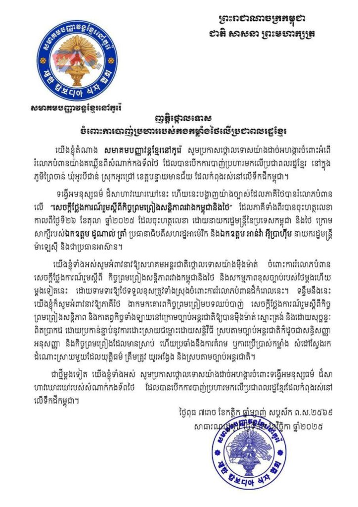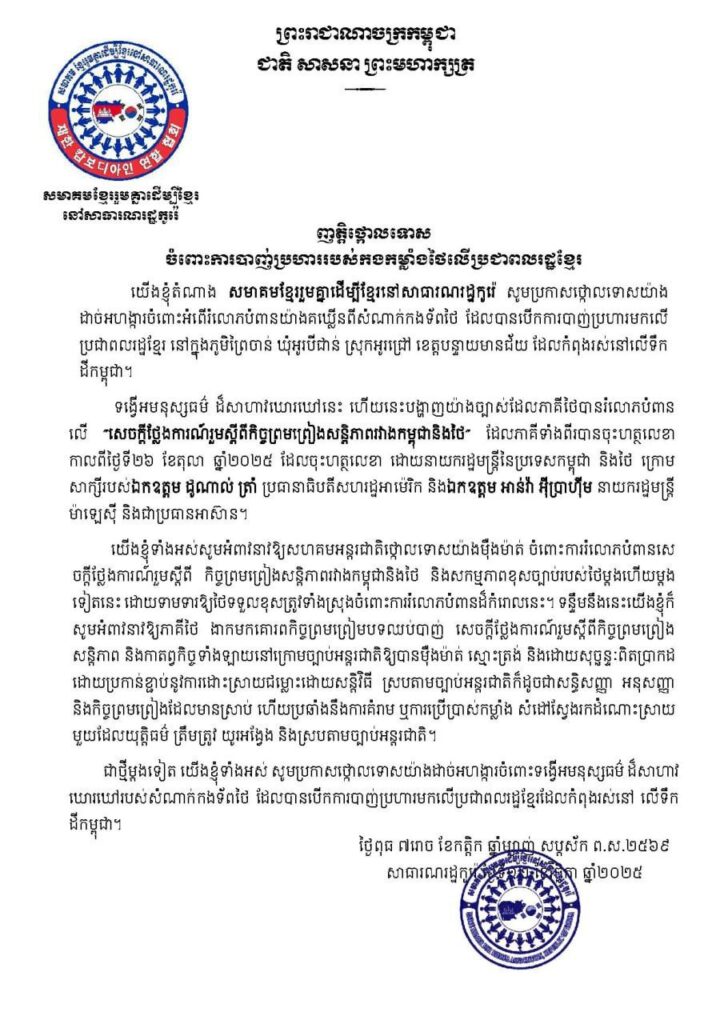 សមាគមខ្មែរចំនួន៦ នៅកូរ៉េខាងត្បូង ចេញញត្តិថ្កោលទោស ចំពោះការបាញ់ប្រហារ របស់កងកម្លាំងថៃ លើប្រជាពលរដ្ឋខ្មែរ ដែលជាជនស៊ីវិលស្លូតត្រង់