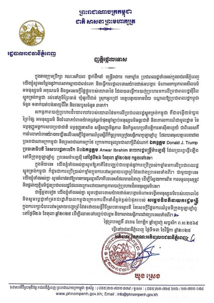 រដ្ឋបាលរាជធានីភ្នំពេញ ចាត់ទុកសកម្មភាពបាញ់ប្រហារដ៏ឃោរឃៅ របស់យោធាថៃមកលើប្រជាពលរដ្ឋស្លូតត្រង់កម្ពុជា គឺជាទង្វើយង់ឃ្នង ព្រៃផ្សៃ អមនុស្សធម៌ និងរំលោភបំពានយ៉ាងធ្ងន់ធ្ងរបំផុត នូវច្បាប់មនុស្សធម៌អន្តរជាតិ និងគោលការណ៍ជាមូលដ្ឋាន នៃ ធម្មនុញ្ញអង្គការសហប្រជាជាតិ ធម្មនុញ្ញអាស៊ាន សន្ធិសញ្ញាមិត្តភាព និងកិច្ចសហប្រតិបត្តិការអាស៊ីអាគ្នេយ៍ ជាពិសេសគឺ ការរំលោភបំពានយ៉ាងគឃ្លីន លើសេចក្តីថ្លែងការណ៍រួម ស្តីពីកិច្ចព្រមព្រៀងសន្តិភាពគូឡាឡាំពួ ដែលបានចុះហត្ថលេខារវាង ព្រះរាជាណាចក្រកម្ពុជា និងព្រះរាជាណាចក្រថៃ ក្រោមការចូលរួមជាសាក្សីពីសំណាក់ លោក Donald J. Trump ប្រធានាធិបតី នៃសហរដ្ឋអាមេរិក និងលោក Anwar Ibrahim នាយករដ្ឋមន្ត្រីម៉ាឡេស៊ី ដែលប្រារព្ធធ្វើឡើង នៅទីក្រុងតូឡាឡាំពួ ប្រទេសម៉ាឡេស៊ី នៅថ្ងៃទី២៦ ខែតុលា ឆ្នាំ២០២៥ កន្លងទៅនេះ។