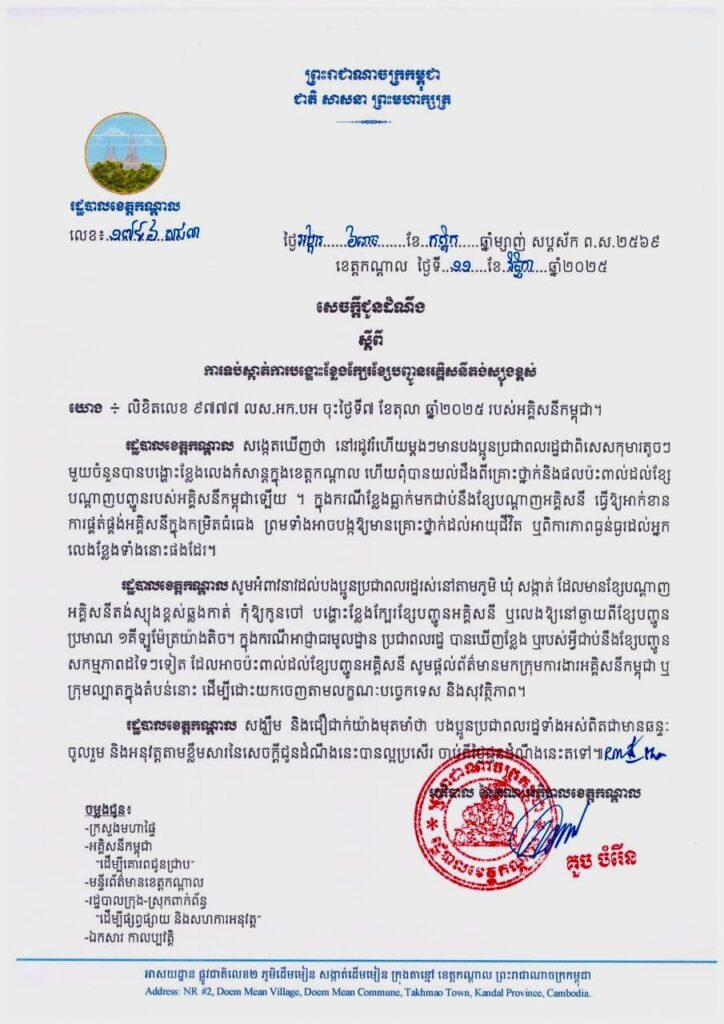 រដ្ឋបាលខេត្តកណ្តាល ទប់ស្កាត់ការបង្ហោះខ្លែង ក្បែរខ្សែបញ្ជូនអគ្គិសនី តង់ស្យុងខ្ពស់