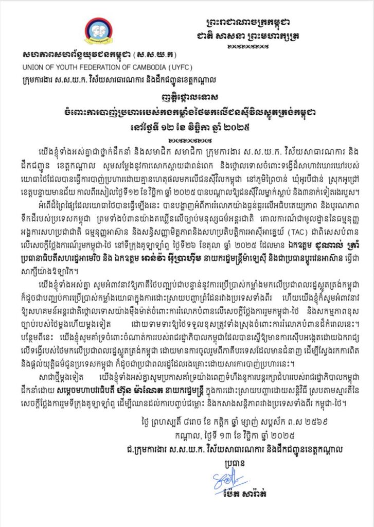 ភ្នំពេញ៖ ក្រុមការងារសហភាពសហព័ន្ធយុវជនកម្ពុជា (ស.ស.យ.ក) វិស័យសាធារណការ និងដឹកជញ្ជួនខេត្តកណ្ដាល បានចេញញាត្តិថ្កោលទោស ចំពោះការបាញ់ប្រហាររបស់កងកម្លាំងថៃ មកលើជនស៊ីវិលស្លូតត្រង់កម្ពុជា កាលពីថ្ងៃទី១២ ខែវិច្ឆកា ឆ្នាំ២០២៥។