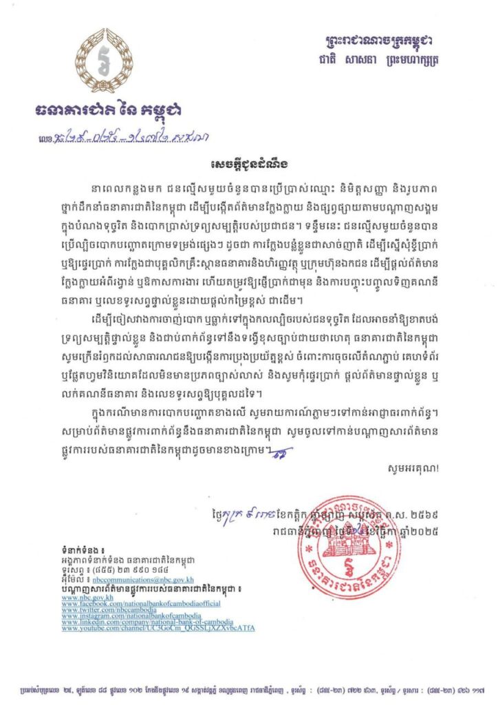 ការលើកឡើងរបស់ធនាគារជាតិនេះ ព្រោះពេលកន្លងមក ជនល្មើសមួយចំនួនបានប្រើប្រាស់ឈ្មោះ និមិត្តសញ្ញា និងរូបភាព ថ្នាក់ដឹកនាំធនាគារជាតិនៃកម្ពុជា ដើម្បីបង្កើតព័ត៌មានក្លែងក្លាយ និងផ្សព្វផ្សាយតាមបណ្តាញសង្គម ក្នុងបំណងទុច្ចរិត និងបោកប្រាស់ទ្រព្យសម្បត្តិរបស់ប្រជាជន។