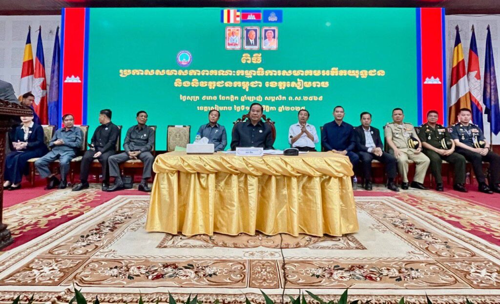 ខេត្តសៀមរាប៖ នៅព្រឹកថ្ងៃទី១៤ ខែវិច្ឆិកា ឆ្នាំ២០២៥ នៅសាលប្រជុំធំសាលាខេត្ត បានប្រារព្វពិធីប្រកាសសមាសភាពគណៈកម្មាធិការសមាគមអតីតយុទ្ធជន និងនិវត្តជនកម្ពុជាខេត្តសៀមរាប ក្រោមអធិបតីភាពដ៏ខ្ពង់ខ្ពស់ នាយឧត្តមសេនីយ៍ កិត្តិសង្គហបណ្ឌិត គន់ គីម ទេសរដ្ឋមន្ត្រី អនុប្រធាន និងជាអគ្គលេខាធិការអចិន្ត្រៃយ៍ គណៈកម្មាធិការកណ្តាល នៃសមាគមអតីតយុទ្ធជន និងនិវត្តជនកម្ពុជា តំណាងដ៏ខ្ពង់ខ្ពស់ សម្តេចអគ្គមហាសេនាបតីតេជោ ហ៊ុន សែន ប្រធានសមាគមអតីតយុទ្ធជន និងនិវត្តជនកម្ពុជា។