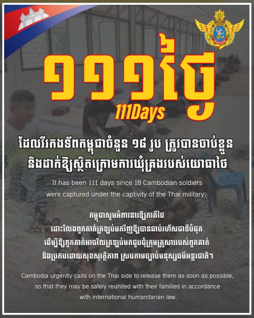 សូមបញ្ជាក់ថា គិតមកត្រឹមថ្ងៃនេះ ជាថ្ងៃទី១១១ហើយ ដែលវីរកងទ័ពកម្ពុជា ចំនួន ១៨រូប ត្រូវបានចាប់ខ្លួន និងដាក់ឱ្យស្ថិតក្រោមការឃុំគ្រងរបស់យោធាថៃ។ កម្ពុជា នៅតែអំពាវនាវឱ្យភាគីថៃ ដោះលែងពួកគាត់ត្រឡប់មកវិញ ឱ្យបានឆាប់រហ័សជាទីបំផុត ដើម្បីឱ្យពួកគាត់អាចវិលត្រឡប់ មកជួបជុំក្រុមគ្រួសារ របស់ពួកគាត់ និងប្រកបដោយសុខ សុវត្ថិភាព ស្របតាមច្បាប់មនុស្សធម៌អន្តរជាតិ ។ ក្នុងនោះរាជរដ្ឋាភិបាលកម្ពុជា បាននឹងកំពុងធ្វើការយ៉ាង សស្រាក់សស្រាំ ឥតឈប់ឈរ នូវគ្រប់យន្តការដោះស្រាយទាំងអស់លើករណីនេះ ដើម្បីឱ្យភាគីថៃ ដោះលែងកង កម្លាំងរបស់កម្ពុជាទាំង១៨នាក់នោះ វិលត្រលប់មកវិញឱ្យបានឆាប់រហ័សជាទីបំផុត និងដោយសុខសុវត្ថិភាព៕