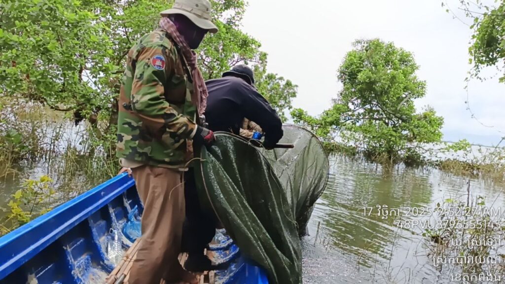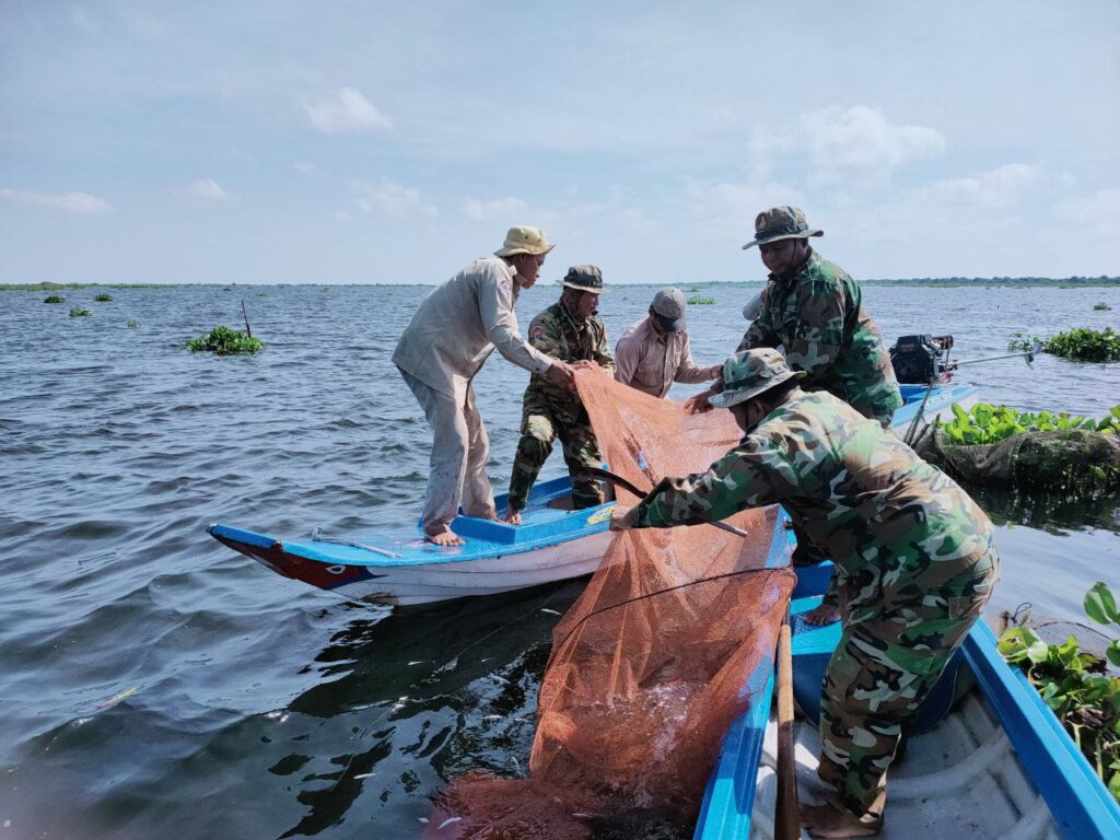 កំពង់ធំ៖ លោក ចាយ​ គង់​ម៉េង​ នាយរងខណ្ឌរដ្ឋបាលជលផលកំពង់​ធំ សហការជាមួយសង្កាត់រដ្ឋបាលជលផលកំពង់ស្វាយលើ  ដឹកនាំកម្លាំងមន្រ្តី​ខណ្ឌជលផលកំពង់ធំ មន្ត្រីជាប់កិច្ចសន្យា និងសហគមន៍​នេសាទសាមគ្គីអភិវឌ្ឍន៍បឹងស្ពង់ សហការជាមួយ​កម្លាំងទីបញ្ជាការស្រាលស្រុកកំពង់ស្វាយ ចុះទប់ស្កាត់ និងបង្ក្រាបបទល្មើសជលផលនៅលើផ្ទៃបឹងទន្លេសាបក្នុងភូមិសាស្ត្រខេត្តកំពង់ធំនាថ្ងៃទី១៧ខែវិច្ឆិកា ឆ្នាំ២០២៥។