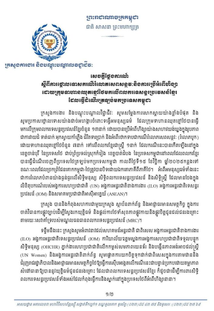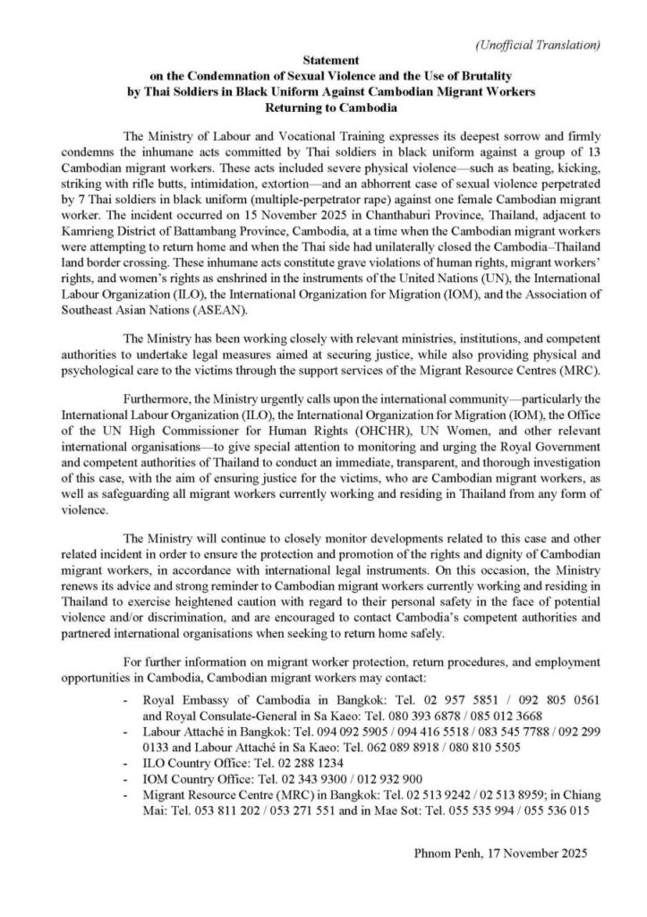 ភ្នំពេញ ៖ ក្រសួងការងារ និង បណ្តុះបណ្តាលវិជ្ជាជីវៈ សូមសម្តែងការសោកស្តាយយ៉ាងខ្លាំងបំផុត និងសូមប្រកាសថ្កោលទោស យ៉ាងដាច់អហង្ការ ចំពោះទង្វើអមនុស្សធម៌ ដែលក្រុមទាហានឈុតខ្មៅថៃ បានធ្វើមកលើក្រុមពលករទេសន្តរប្រវេសន៍ខ្មែរ ចំនួន ១៣នាក់ ដោយបានប្រើអំពើហិង្សាយ៉ាងសាហាវយង់ឃ្នង ក្នុងរូបភាពជាការវាយដំ ទាត់ធាក់ អុកស្វាយកាំភ្លើង ជំរិតទារប្រាក់ និងអំពើថោកទាប ជាករណីរំលោភសេពសន្ថវៈ (រំលោភបូក) ដោយទាហានឈុតខ្មៅថៃចំនួន ៧នាក់ ទៅលើពលករខ្មែរជាស្រ្តី ១នាក់ ដែលករណីនេះបានកើតឡើងនៅក្នុងខេត្តចាន់បុរី នៃប្រទេសថៃ ជាប់ព្រំប្រទល់ស្រុកកំរៀង ខេត្តបាត់ដំបង នៃប្រទេសកម្ពុជានៅពេលដែលពលករខ្មែរបានធ្វើដំណើរចេញពីប្រទេសថៃត្រឡប់មកប្រទេសកម្ពុជា កាលពីថ្ងៃទី១៥ ខែវិច្ឆិកា ឆ្នាំ២០២៥កន្លងទៅ ខណៈដែលច្រកព្រំដែនគោក កម្ពុជា-ថៃ ត្រូវបានបិទដោយ ឯកតោភាគីពីភាគីថៃ ។ នេះបើយោងតាមសេចក្តីថ្លែងការណ៍ ដែលបានចេញនៅថ្ងៃទី១៨ ខែវិច្ឆិកា ឆ្នាំ២០២៥នេះ។