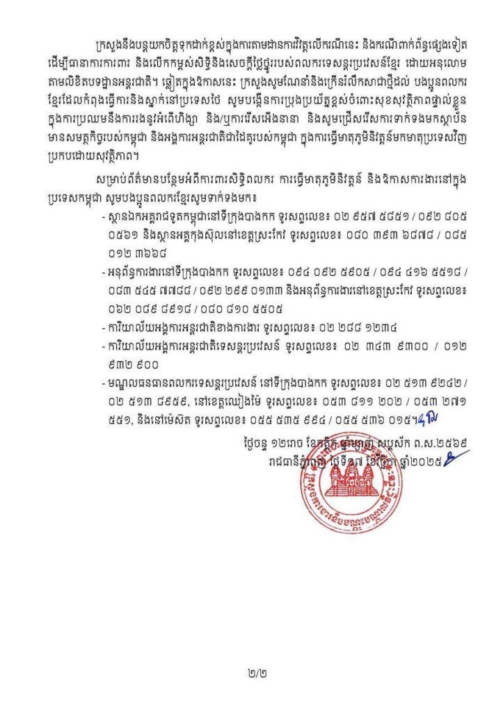 ក្រសួងនឹងបន្តយកចិត្តទុកដាក់ខ្ពស់ក្នុងការតាមដានការវិវត្តលើករណីនេះ និងករណីពាក់ព័ន្ធផ្សេងទៀត ដើម្បីធានាការការពារ និងលើកកម្ពស់សិទ្ធិនិងសេចក្ដីថ្លៃថ្នូររបស់ពលករទេសន្តរប្រវេសន៍ខ្មែរ ដោយអនុលោមតាមលិខិតបទដ្ឋានអន្តរជាតិ។ ឆ្លៀតក្នុងឱកាសនេះ ក្រសួងសូមណែនាំនិងក្រើនរំលឹកសាជាថ្មីដល់ បងប្អូនពលករខ្មែរដែលកំពុងធ្វើការនិងស្នាក់នៅប្រទេសថៃ សូមបង្កើនការប្រុងប្រយ័ត្នខ្ពស់ចំពោះសុខសុវត្ថិភាពផ្ទាល់ខ្លួនក្នុងការប្រឈមនឹងការរងនូវអំពើហិង្សា និង/ឬការរើសអើងនានា និងសូមជ្រើសរើសការទាក់ទងមកស្ថាប័នមានសមត្ថកិច្ចរបស់កម្ពុជា និងអង្គការអន្តរជាតិជាដៃគូរបស់កម្ពុជា ក្នុងការធ្វើមាតុភូមិនិវត្តន៍មកមាតុប្រទេសវិញប្រកបដោយសុវត្ថិភាព។ នេះបើយោងតាមសេចក្តីថ្លែងការណ៍ដដែល៕