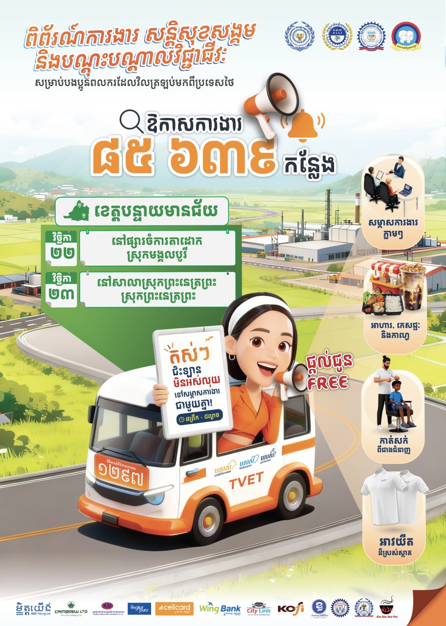 ភ្នំពេញ៖ ក្រសួងការងារ និងបណ្ដុះបណ្ដាលវិជ្ជាជីវៈ នឹងបន្តរៀបចំពិព័រណ៍ការងារ សន្តិសុខសង្គម និងបណ្តុះបណ្តាលវិជ្ជាជីវៈ ដោយនាំយកឱកាសការងាររាប់ម៉ឺនកន្លែងសម្រាប់បងប្អូនអតីតពលករដែលត្រឡប់មកពីថៃ យុវជន និងអ្នកស្វែងរកការងារ នៅខេត្តបន្ទាយមានជ័យ រយៈពេល២ថ្ងៃនាចុងសប្តាហ៍នេះនៅថ្ងៃទី២២ និងទី២៣ ខែវិច្ឆិកា ឆ្នាំ២០២៥។
