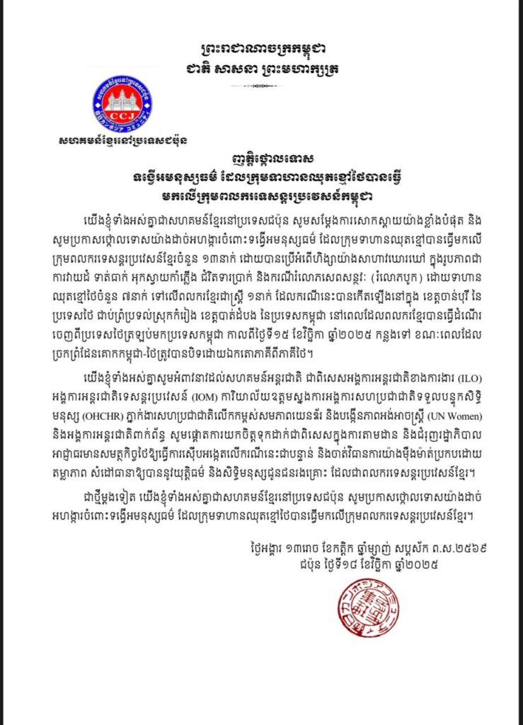 ភ្នំពេញ ៖ សហគមន៍ខ្មែរ នៅប្រទេសជប៉ុន ទាំងអស់ នៅថ្ងៃទី១៩ ខែវិច្ឆិកា ឆ្នាំ២០២៥នេះ បានចេញញត្តិប្រកាសថ្កោលទោស យ៉ាងដាច់អហង្ការចំពោះទង្វើ អមនុស្សធម៌ ព្រៃផ្សៃយង់ឃ្នង របស់ក្រុមទាហានឈុតខ្មៅថៃ ដែលបានធ្វើមកលើក្រុមពលករ ទេសន្តរប្រវេសន៍ខ្មែរចំនួន ១៣នាក់ និងអំពើថោកទាបជាករណីរំលោភសេព សន្ថវៈយ៉ាងព្រៃផ្សៃ។