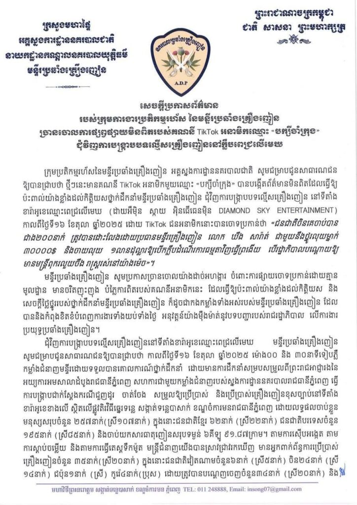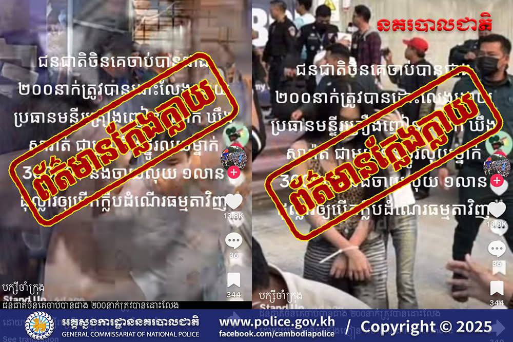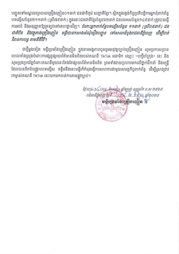 ភ្នំពេញ ៖ ក្រុមការងារប្រតិកម្មរហ័ស នៃមន្ទីរប្រឆាំងគ្រឿងញៀន បានច្រានចោលចំពោះការផ្សព្វផ្សាយមិនពិតរបស់គណនី TikTok មួយថា សមត្ថកិច្ចបានដោះលែងជនជាតិចិនជាង២០០នាក់ ជាថ្នូរជាមួយលុយ៣ម៉ឺនដុល្លារដល់សមត្ថកិច្ចម្នាក់នោះ គឺជារឿងមិនពិតនោះទេ ។ ចំពោះការផ្សាយបែបនេះ មន្ទីរប្រឆាំងគ្រឿងញៀនអះអាងថា បានបង្កើតព័ត៌មានមិនពិតដែលធ្វើឱ្យប៉ះពាល់យ៉ាងខ្លាំងដល់កិត្តិយសថ្នាក់ដឹកនាំមន្ទីរប្រឆាំងគ្រឿងញៀន។