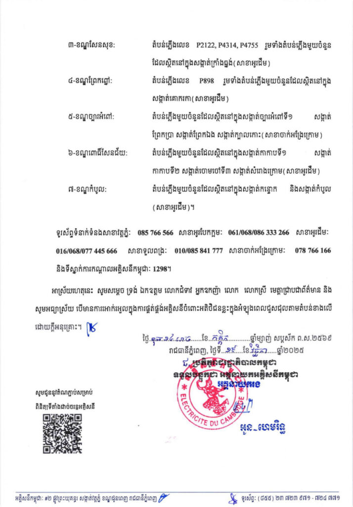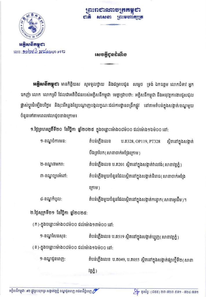 សូមអានសេចក្តីជូនដំណឹង របស់អគ្គិសនីកម្ពុជា ដូចខាងក្រោម ៖