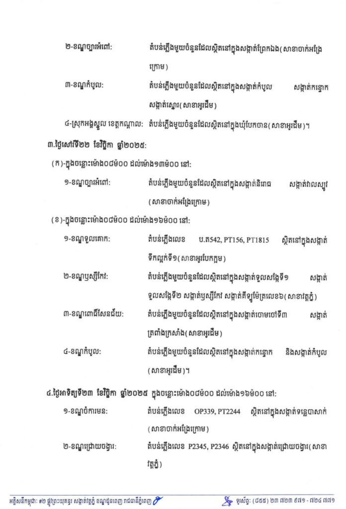 ភ្នំពេញ ៖ អគ្គិសនីកម្ពុជា (EDC) បានចេញសេចក្តីជូនដំណឹង ស្តីពីការអនុវត្តការងារជួសជុល ផ្លាស់ប្តូរដំឡើងបរិក្ខារនានា និងរុះរើគន្លងខ្សែបណ្តាញ អគ្គិសនីរបស់អគ្គិសនីកម្ពុជា ដើម្បីបង្កលក្ខណៈងាយស្រួល ដល់ការដ្ឋានពង្រីកផ្លូវ នៅថ្ងៃទី២០ ខែវិច្ឆិកា ឆ្នាំ២០២៥ ដល់ថ្ងៃទី២៣ ខែវិច្ឆិកា ឆ្នាំ២០២៥ នៅតំបន់មួយចំនួនទៅ តាមពេលវេលា និងទីកន្លែងដូចសេចក្តីជូនដំណឹងលម្អិតខាងក្រោម ។