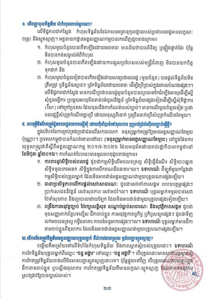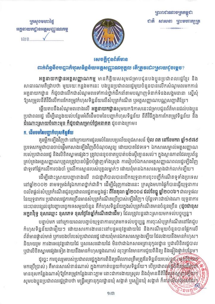 យោងតាមសេចក្ដីសេចក្តីជូនព័ត៌មាន របស់អគ្គនាយកដ្ឋាន អត្តសញ្ញាណកម្ម ពាក់ព័ន្ធនឹងបញ្ហាកំហុស ទិន្នន័យអត្តសញ្ញាណបុគ្គល តើត្រូវដោះស្រាយដូចម្តេច? ចេញផ្សាយនាថ្ងៃទី១៩ វិច្ឆិកា បានឲ្យដឹងថា កន្លងមក អគ្គនាយកដ្ឋានអត្តសញ្ញាណកម្ម ជាសេនាធិការ របស់ក្រសួងមហាផ្ទៃ និងរាជរដ្ឋាភិបាលកម្ពុជា បានយកចិត្តទុកដាក់យ៉ាងខ្លាំង លើការងារនេះ ដោយបានដាក់ចេញ នូវនីតិវិធីនៃការកែតម្រូវទិន្នន័យ និងដំណោះស្រាយជាបន្តបន្ទាប់ តាំងពីឆ្នាំ២០១៧។
