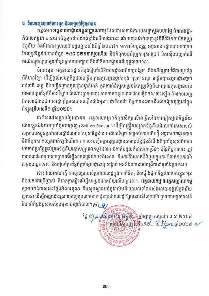 អគ្គនាយកដ្ឋានអត្តសញ្ញាណកម្ម គូសបញ្ជាក់ថា មកទល់បច្ចុប្បន្ន អគ្គនាយកដ្ឋានបានសម្រេច កែតម្រូវទិន្នន័យបានចំនួន ១៤៨.៨២៩នាក់រួចហើយ និងកំពុងបន្តជំរុញការស្រាវជ្រាវ និងស៊ើបបញ្ជាក់លើ ករណីស្មុគស្មាញមួយចំនួនស្របតាមច្បាប់ និងលិខិតបទដ្ឋានគតិយុត្តជាធរមាន។