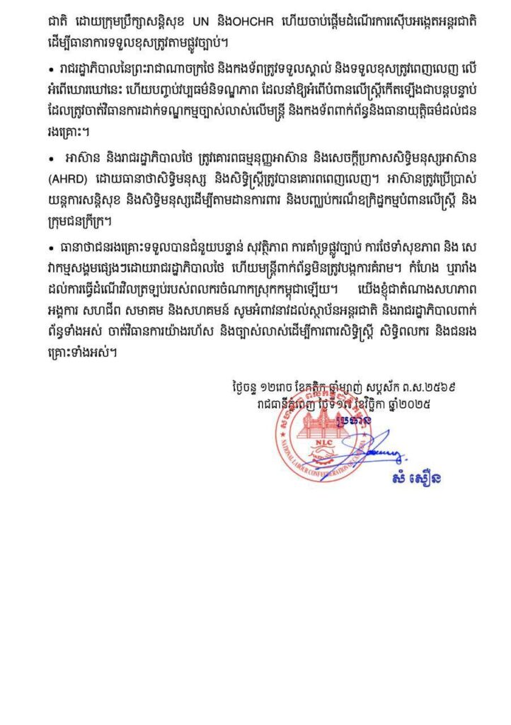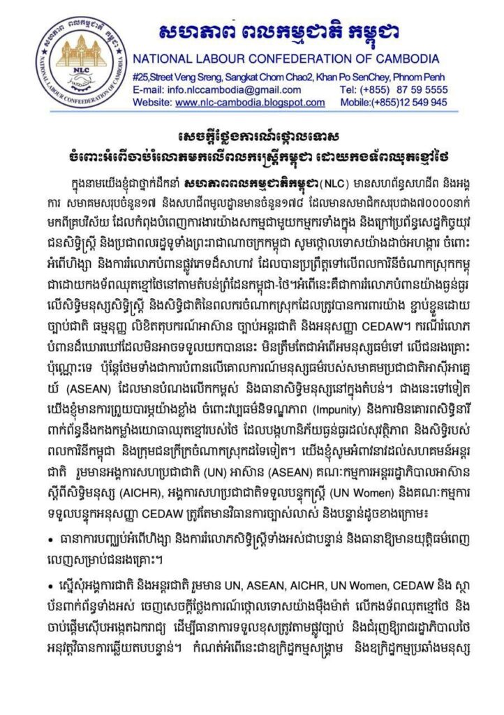 សេចក្ដីថ្លែងការណ៍ លើកឡើងថា ក្នុងនាមជាថ្នាក់ដឹកនាំសហភាពពលកម្មជាតិកម្ពុជា (NLC) មានសហព័ន្ធសហជីព និងអង្គការ-សមាគមសរុបចំនួន ១៧ និងសហជីពមូលដ្ឋានមានចំនួន ១៧៨ ដែលមានសមាជិកសរុបជាង ៧០ ០០០នាក់ មកពីគ្របវិស័យ ថ្កោលទោសយ៉ាងដាច់អហង្ការ ចំពោះអំពើហិង្សា និងការរំលោភបំពានផ្លូវភេទដ៏សាហាវ ដែលបានប្រព្រឹត្តទៅលើពលការិនីចំណាកស្រុកកម្ពុជា ដោយកងទ័ពឈុតខ្មៅថៃ នៅតាមតំបន់ព្រំដែនកម្ពុជា-ថៃ។