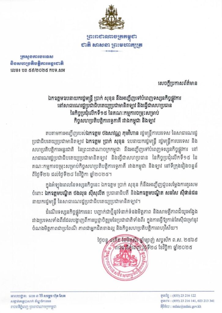 ភ្នំពេញ៖ លោកឧបនាយករដ្ឋមន្ត្រី ប្រាក់ សុខុន រដ្ឋមន្ត្រីការបរទេស និងសហប្រតិបត្តិការអន្តរជាតិនៃព្រះរាជាណាចក្រកម្ពុជា នឹងអញ្ជើញទៅបំពេញទស្សនកិច្ចផ្លូវការ នៅសាធារណរដ្ឋប្រជាធិបតេយ្យប្រជាមានិតឡាវ និងធ្វើជាសហប្រធាន នៃកិច្ចប្រជុំលើកទី១៥ នៃគណៈកម្មការចម្រុះសម្រាប់កិច្ចសហប្រតិបត្តិការទ្វេភាគីរវាង កម្ពុជា និងឡាវ ចាប់ពីថ្ងៃទី២៦ ដល់ថ្ងៃទី២៨ ខែវិច្ឆិកា ឆ្នាំ២០២៥ នៅទីក្រុងវៀងចន្ទន៍។