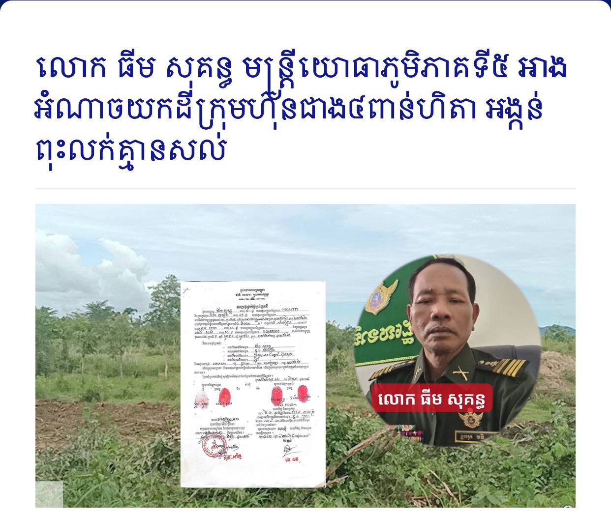 បុគ្គល ធីម សុគន្ធ យកដីក្រុមហ៊ុនជាង៤ ពាន់ហិកតា ពុះឡូតិ៍លក់ ពុំមែនជាមន្រ្តីយោធា នៅយោធភូមិភាគទី៥ទេ