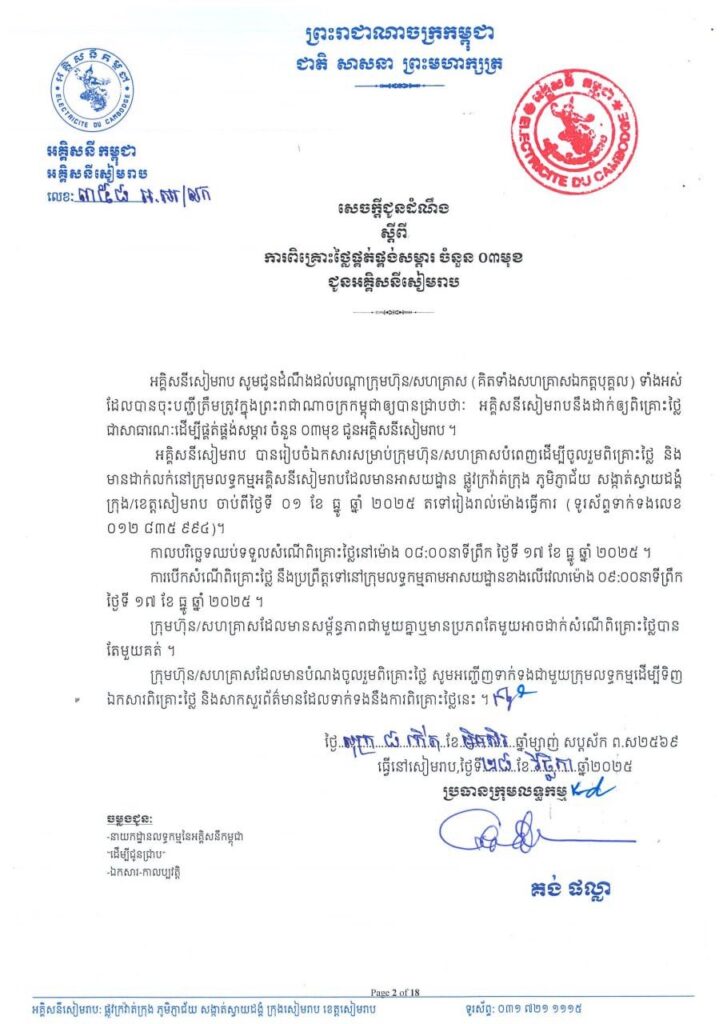 អគ្គិសនីសៀមរាប បានរៀបចំឯកសារ សម្រាប់ក្រុមហ៊ុន/សហគ្រាសបំពេញ ដើម្បីចូលរួមពិគ្រោះថ្លៃ និង មានដាក់លក់នៅក្រុមលទ្ធកម្មអគ្គិសនីសៀមរាប ដែលមានអាសយដ្ឋាន ផ្លូវក្រវ៉ាត់ក្រុង ភូមិភ្ញាជ័យ សង្កាត់ស្វាយដង្គំ ក្រុង/ខេត្តសៀមរាប ចាប់ពីថ្ងៃទី ០១ ខែ ធ្នូ ឆ្នាំ ២០២៥ តទៅរៀងរាល់ម៉ោងធ្វើការ (ទូរស័ព្ទទាក់ទងលេខ ០១២ ៨៣៥ ៩៩៤) ។