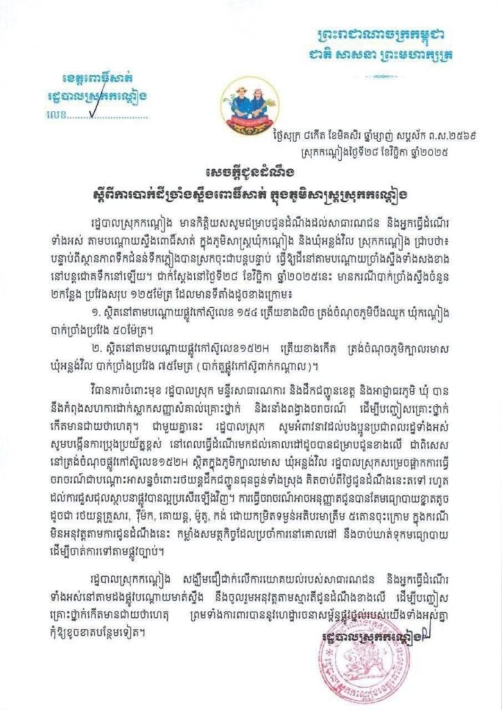 ខេត្តពោធិ៍សាត់÷ រដ្ឋបាលស្រុកកណ្តៀង មានកិត្តិយសសូមជម្រាបជូនដំណឹងដល់សាធារណជន និងអ្នកធ្វើដំណើរ ទាំងអស់ តាមបណ្តោយស្ទឹងពោធិ៍សាត់ ក្នុងភូមិសាស្ត្រឃុំកណ្តៀង និងឃុំអន្លង់វិល ស្រុកកណ្តៀង ជ្រាបថា៖ បន្ទាប់ពីស្ថានភាពទឹកជំនន់ទឹកភ្លៀងបានស្រកចុះជាបន្តបន្ទាប់ ធ្វើឱ្យដីនៅតាមបណ្តោយច្រាំងស្ទឹងទាំងសងខាង នៅបន្តជោគទឹកនៅឡើយ។ ជាក់ស្តែងនៅថ្ងៃទី២៨ ខែវិច្ឆិកា ឆ្នាំ២០២៥នេះ មានករណីបាក់ច្រាំងស្ទឹងចំនួន ២កន្លែង ប្រវែងសរុប ១២៥ម៉ែត្រ ដែលមានទីតាំងដូចខាងក្រោម៖