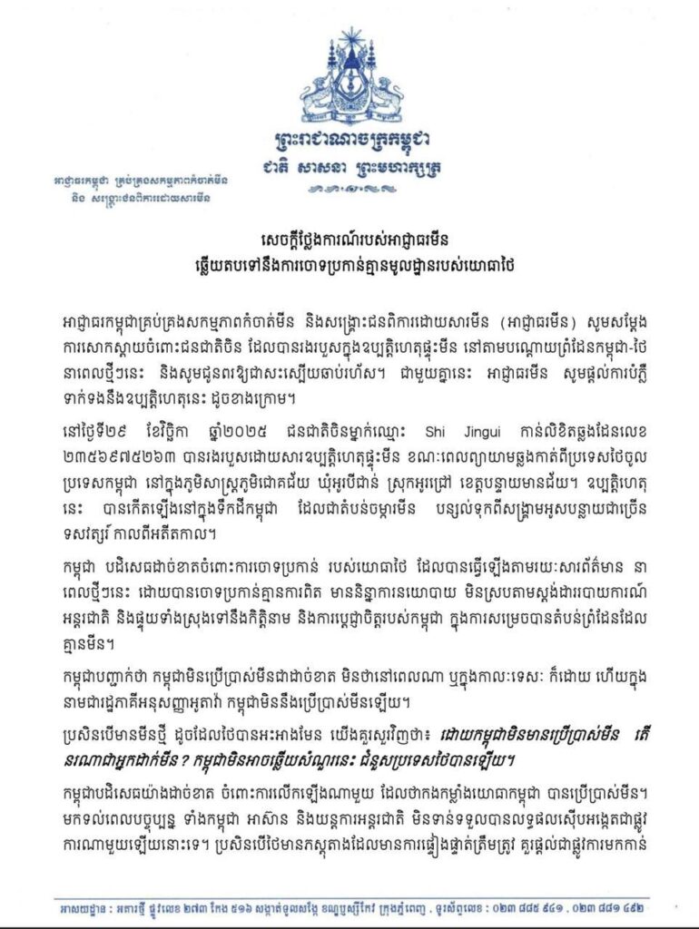 អាជ្ញាធរមីនកម្ពុជា ចេញសេចក្តីថ្លែងការណ៍ឆ្លើយតបទៅនឹង ការចោទប្រកាន់គ្មានមូលដ្ឋានរបស់យោធាថៃ