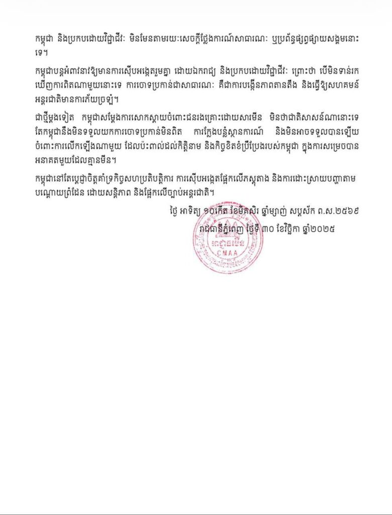 ភ្នំពេញ ៖ នៅថ្ងៃទី៣០ ខែវិច្ឆិកា ឆ្នាំ២០២៥នេះ អាជ្ញាធរកម្ពុជាគ្រប់គ្រងសកម្មភាពកំចាត់មីន និងសង្គ្រោះជនពិការដោយសារមីន (អាជ្ញាធរមីន) បានចេញសេចក្តី ថ្លែងការណ៍ ឆ្លើយ តបទៅនឹងការចោទប្រកាន់គ្មានមូលដ្ឋានរបស់យោធាថៃ។