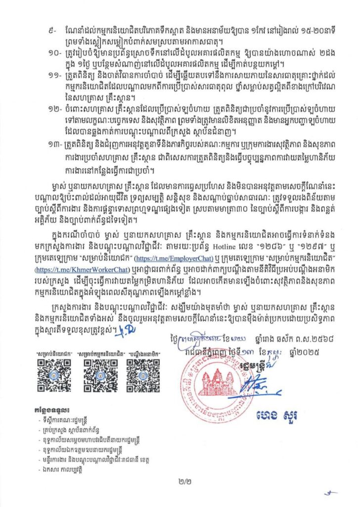 ក្រសួងការងារ និងបណ្តុះបណ្តាលវិជ្ជាជីវៈ សង្ឃឹមយ៉ាងមុតមាំថា ម្ចាស់ ឬនាយកសហគ្រាស គ្រឹះស្ថាន និងកម្មករនិយោជិតទាំងអស់ នឹងចូលរួមអនុវត្តតាមសេចក្តីណែនាំនេះឱ្យបានម៉ឺងម៉ាត់ប្រកបដោយប្រសិទ្ធភាព ក្នុងស្មារតីទទួលខុសត្រូវខ្ពស់៕