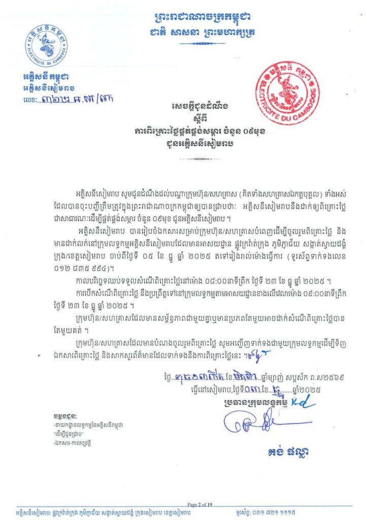 អគ្គិសនីសៀមរាប បានរៀបចំឯកសារ សម្រាប់ក្រុមហ៊ុន/សហគ្រាសបំពេញដើម្បីចូលរួមពិគ្រោះថ្លៃ និង មានដាក់លក់នៅក្រុមលទ្ធកម្ម អគ្គិសនីសៀមរាបដែលមានអាសយដ្ឋាន ផ្លូវក្រវ៉ាត់ក្រុង ភូមិភ្ញាជ័យ សង្កាត់ស្វាយដង្គំ ក្រុង/ខេត្តសៀមរាប ចាប់ពីថ្ងៃទី ០៥ ខែ ធ្នូ ឆ្នាំ ២០២៥ តទៅរៀងរាល់ម៉ោងធ្វើការ (ទូរស័ព្ទទាក់ទងលេខ ០១២ ៨៣៥ ៩៩៤)។