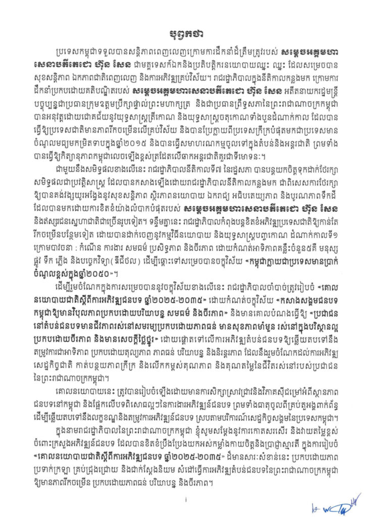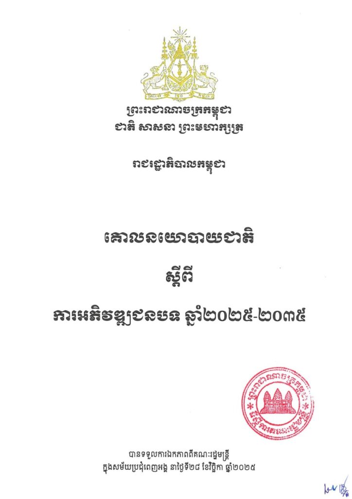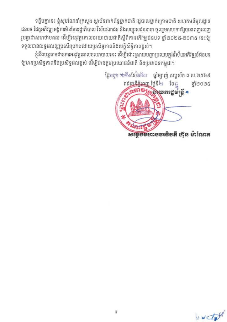 ភ្នំពេញ ៖ ប្រមុខរាជរដ្ឋាភិបាលកម្ពុជា ក្រោមការដឹកនាំរបស់សម្តេចធិបតីហ៊ុន ម៉ាណែត នាយករដ្ឋមន្រ្តី បានដាក់ចេញគោលនយោបាយជាតិស្តីពីការអភិវឌ្ឍជនបទ ឆ្នាំ២០២៥-២០៣៥ ។
