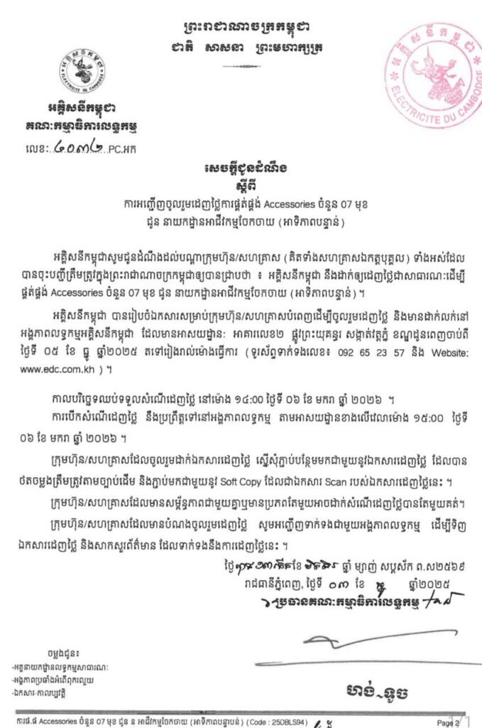 អគ្គិសនីកម្ពុជា បានរៀបចំឯកសារសម្រាប់ក្រុមហ៊ុន/សហគ្រាសបំពេញ ដើម្បីចូលរួមដេញថ្លៃ និងមានដាក់លក់នៅ អង្គភាពលទ្ធកម្មអគ្គិសនីកម្ពុជា ដែលមានអាសយដ្ឋាន: អាគារលេខ២ ផ្លូវព្រះយុគន្ធរ សង្កាត់វត្តភ្នំ ខណ្ឌដូនពេញចាប់ពី ថ្ងៃទី ០៥ ខែ ធ្នូ ឆ្នាំ២០២៥ តទៅរៀងរាល់ម៉ោងធ្វើការ (ទូរស័ព្ទទាក់ទងលេខ៖ 092 65 23 57 និង Website: www.edc.com.kh)។