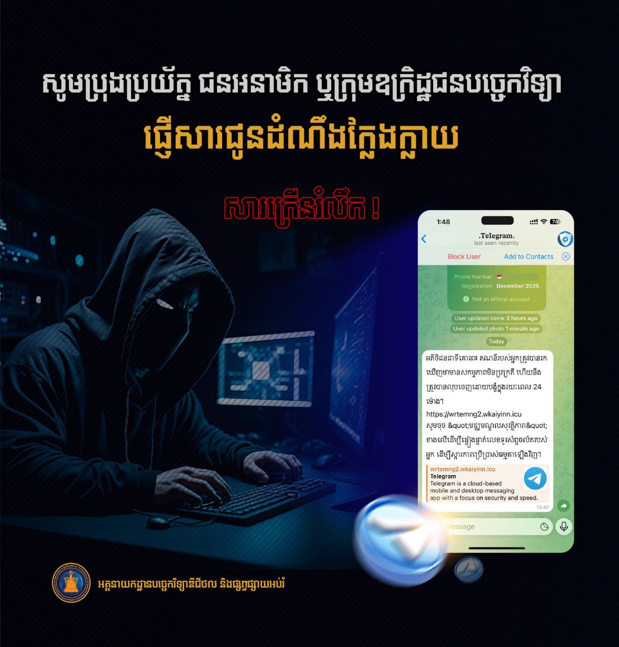 តាមរយៈបណ្ដាញសង្គមហ្វេសប៊ុករបស់ អគ្គនាយកដ្ឋានបច្ចេកវិទ្យាឌីជីថល និងផ្សព្វផ្សាយអប់រំ ក្រសួងមហាផ្ទៃ នាល្ងាចថ្ងៃទី៥ ខែធ្នូ ឆ្នាំ២០២៥ បានគូសបញ្ជាក់ថា «សូមប្រុងប្រយ័ត្នករណីលោកអ្នកទទួលបានសារ ជូនដំណឹងពីជនអនាមិក ឬក្រុមឧក្រិដ្ឋជន បច្ចេកវិទ្យាផ្ញើសារជូនដំណឹង ដើម្បីលួចយកគណនី Telegram របស់លោកអ្នក ដូចករណីក្នុងរូបភាពនេះ »។